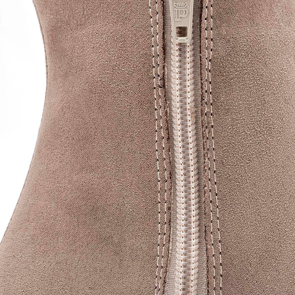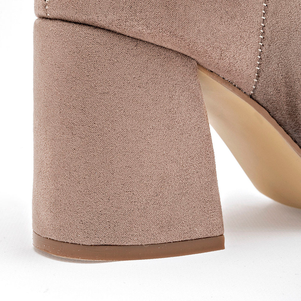 Confeccionado en un suave material de gamuza que lo hace fácil de combinar con cualquier paleta de colores. Su diseño minimalista y depurado destaca por una punta ligeramente cuadrada y un tacón robusto. El tacón tipo bloque de 8 cm proporciona una elevación estilizada, a la vez que asegura estabilidad y comodidad al caminar. El cierre de cremallera lateral en la parte interior facilita un calce rápido y sencillo.