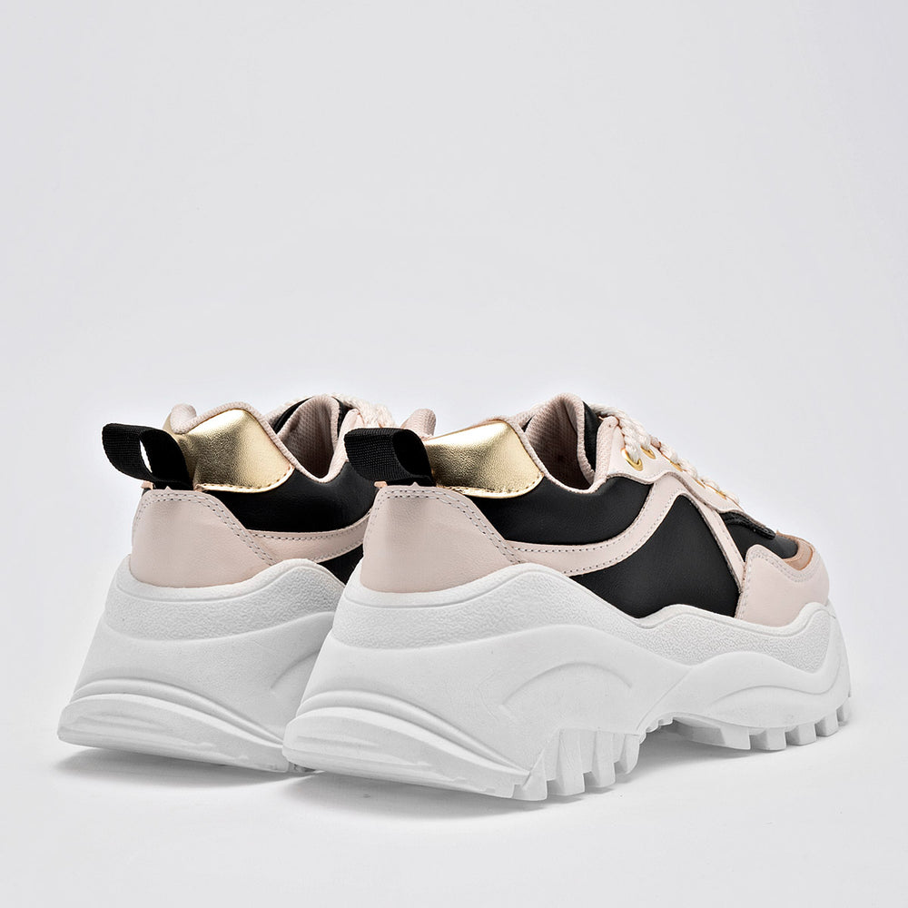 Este es un tenis chunky con una combinación de colores elegante y moderna. La combinación de negro profundo y un suave beige crea una base elegante, realzada por sutiles pero impactantes detalles en dorado metálico que añaden un toque de lujo. Su suela voluminosa no solo sigue la tendencia "chunky", sino que también proporciona una plataforma estable y un diseño escultural que capta todas las miradas. Estos tenis son ideales para el uso diario, permitiéndote moverte con confianza y estilo.
