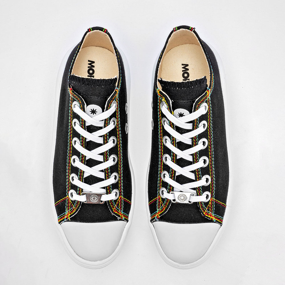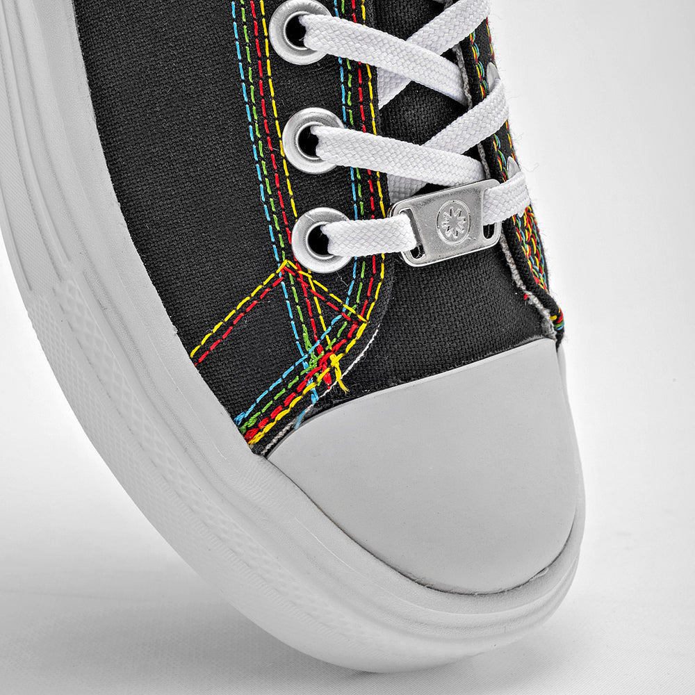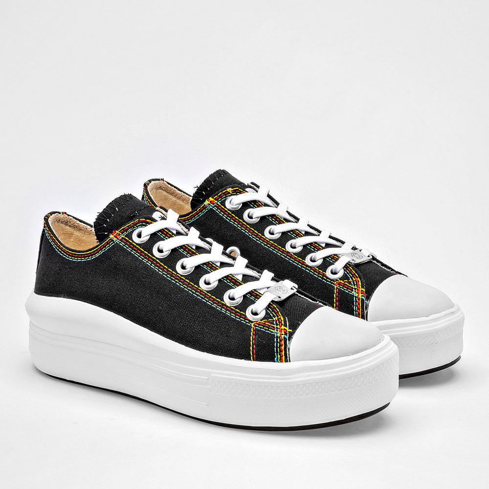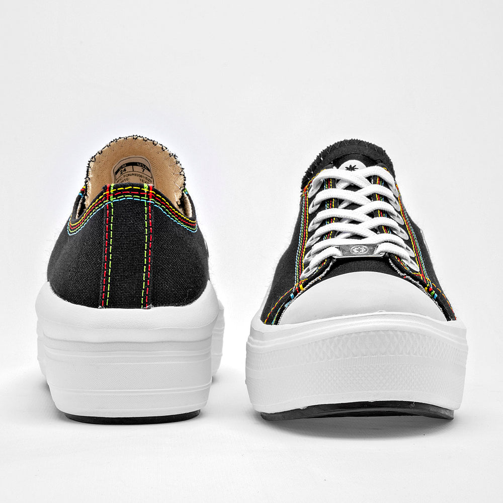 La característica más distintiva es su suela de plataforma blanca, que es gruesa y tiene un diseño ondulado, dándole un toque moderno y único. Las costuras en los bordes de la lona son de colores vivos, lo que crea un contraste llamativo y divertido con el fondo negro del zapato.