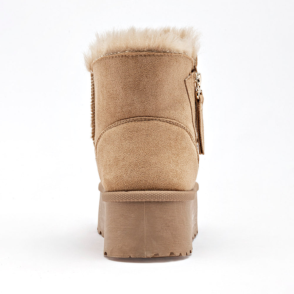 Bota de plataforma para mujer, en color beige con un acabado de gamuza y un forro interior de borrego sintético. El diseño se distingue por un cierre lateral con cremallera y una suela de plataforma gruesa, que ofrece comodidad y estilo.