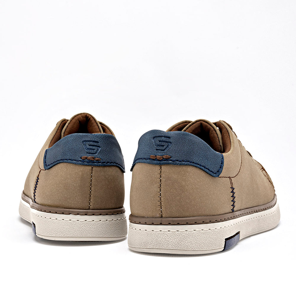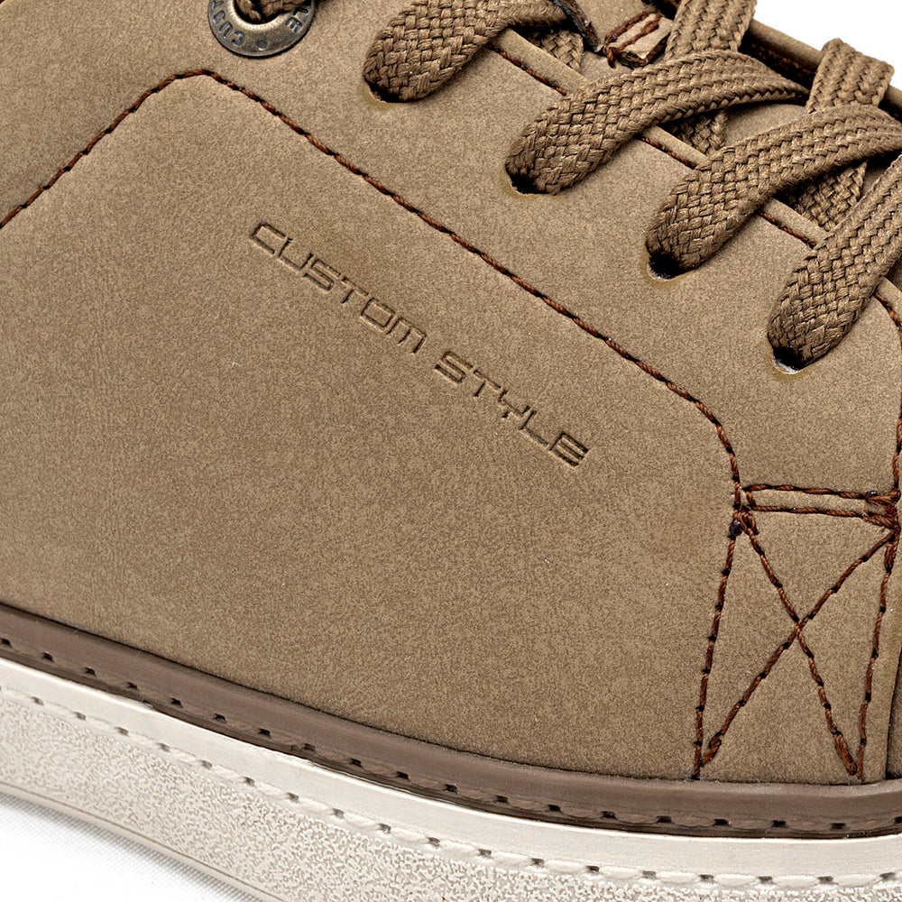 Zapato con un acabado mate tipo gamuza. La parte superior tiene un detalle cosido en los costados y la frase "CUSTOM STYLE" grabada sutilmente. El talón está reforzado con una pieza de color azul marino y una textura rugosa. Los cordones son planos y del mismo color que el calzado.