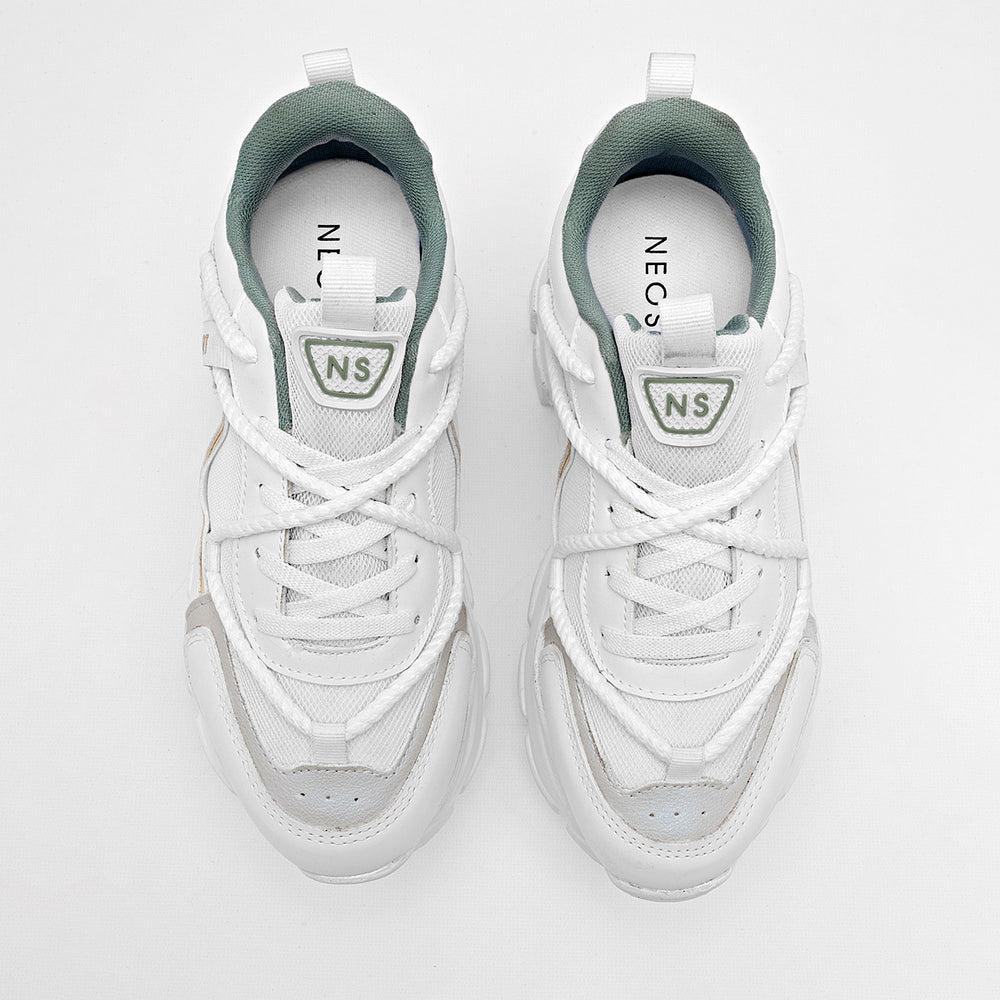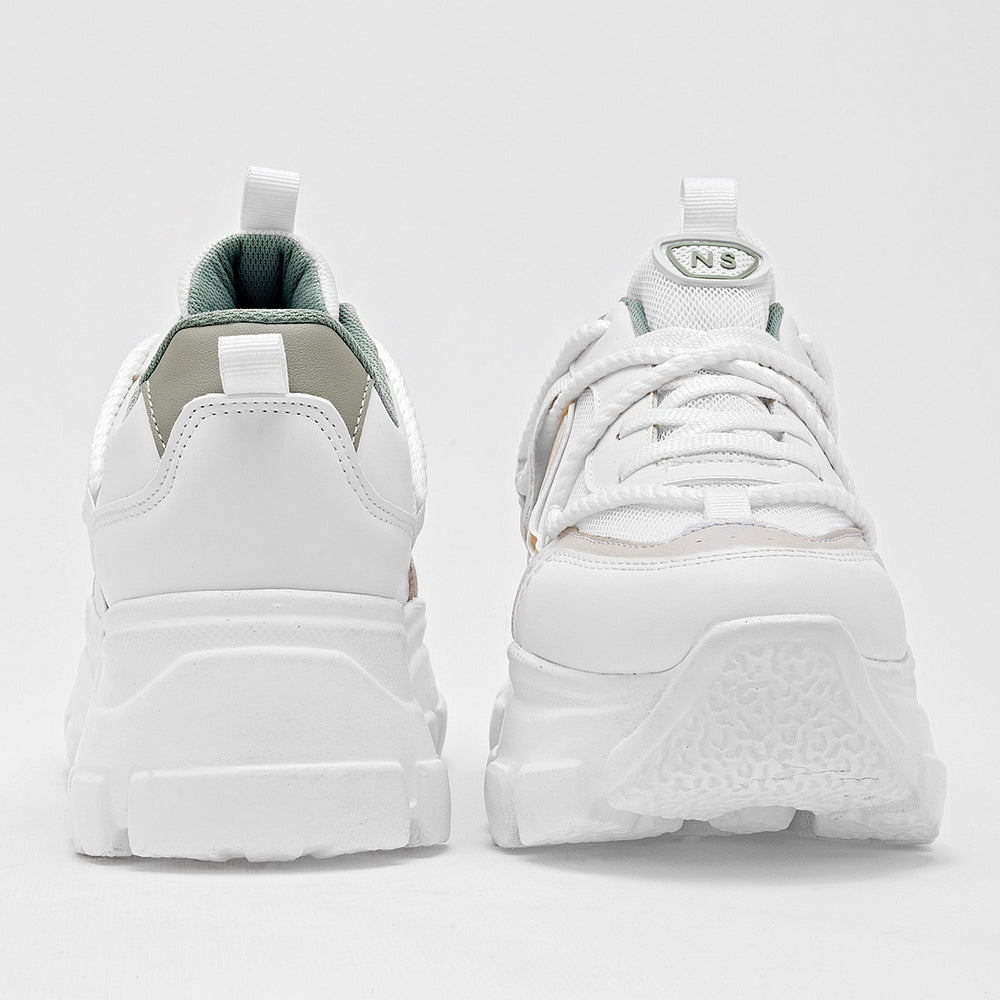 Tenis de plataforma robusta de con detalles en tonos neutros como y verde menta. El diseño presenta una suela estilo "chunky" de 6 cm de altura, la cual es gruesa y con una textura pronunciada, lo que le da un aspecto moderno y urbano. El detalle de las agujetas cruzadas y la cinta con el logo "NEOSPORT" le dan un toque único y deportivo.
