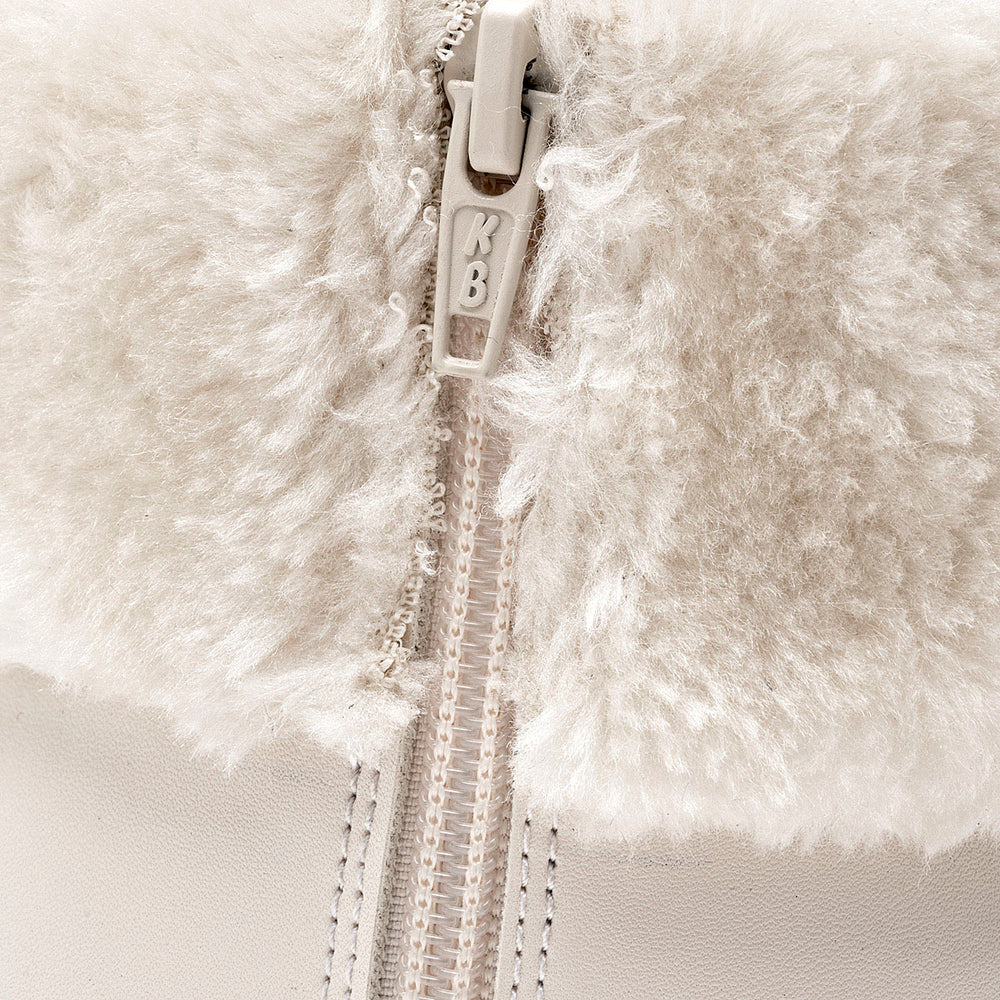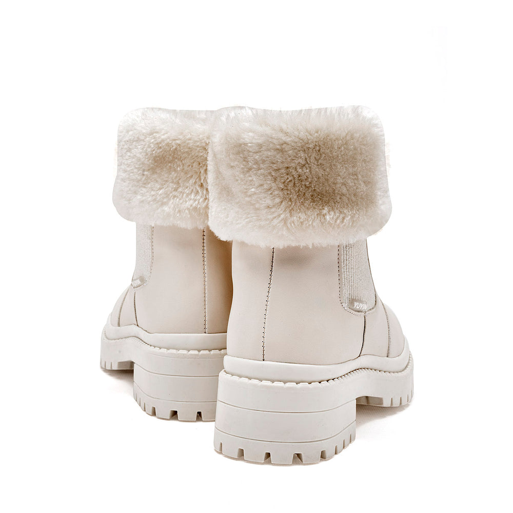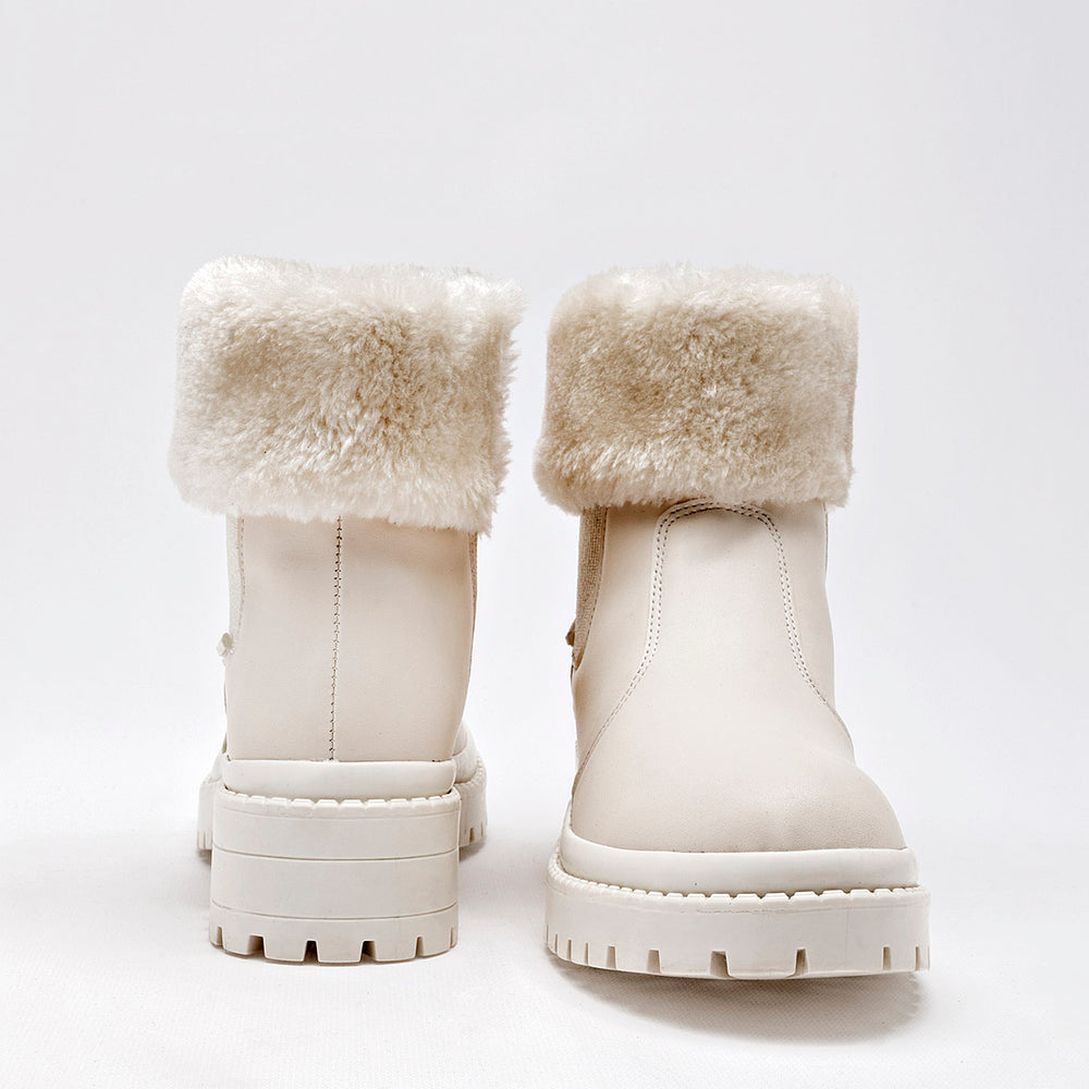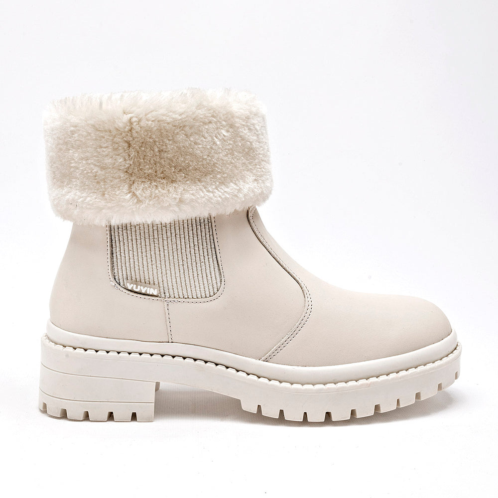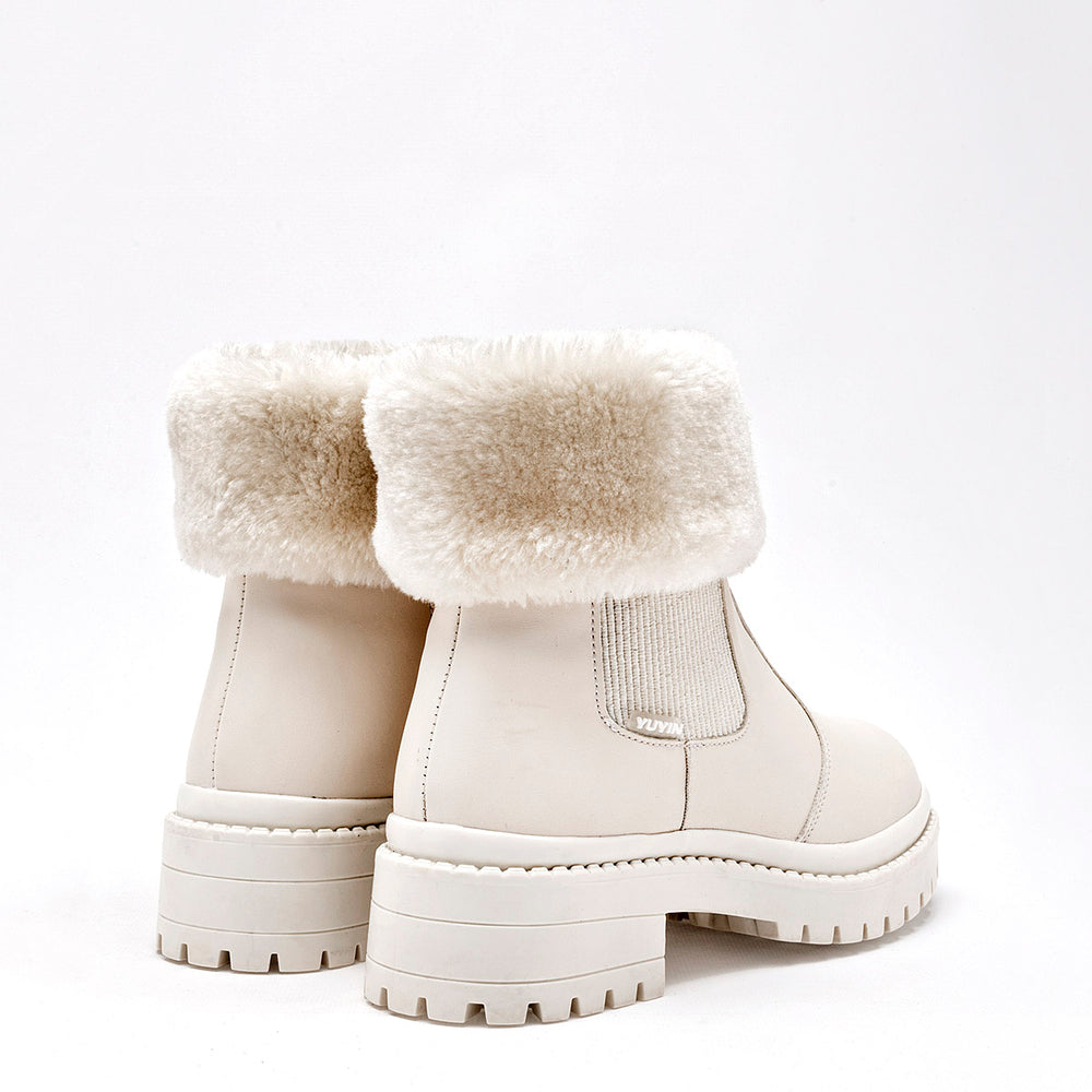 El calzado presenta una parte inferior de acabado liso, con detalles elásticos acanalados en los laterales que facilitan su colocación. La característica más distintiva es la caña, que está forrada con un suave y mullido material de peluche, que se dobla sobre el borde, dándole un aspecto acogedor. La suela es tipo track, gruesa y con un tacón de 4 cm que proporciona un excelente agarre y estabilidad.