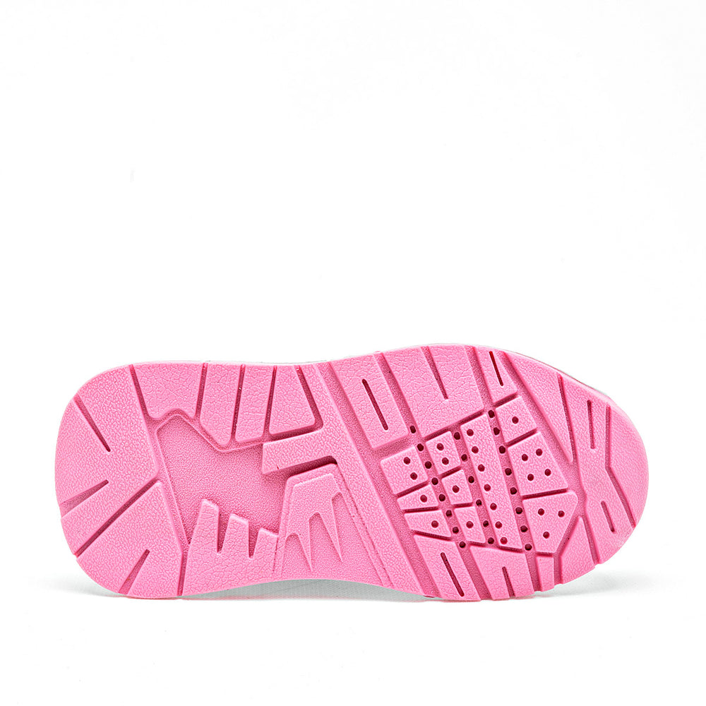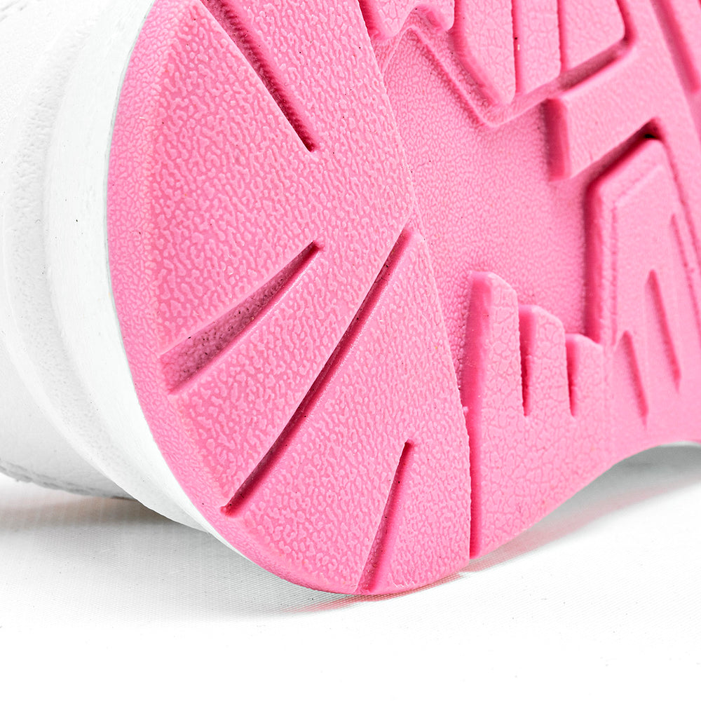 Está fabricado con un material sintético liso de color blanco y tiene detalles en rosa en la suela y una etiqueta con la marca. Un panel en color gris en el talón le da un toque distintivo. El interior es de un material de malla transpirable en color rosa. La suela es de plataforma, gruesa y resistente, ideal para brindar soporte y comodidad durante el uso prolongado. Cuenta con agujetas blancas para un ajuste firme.
