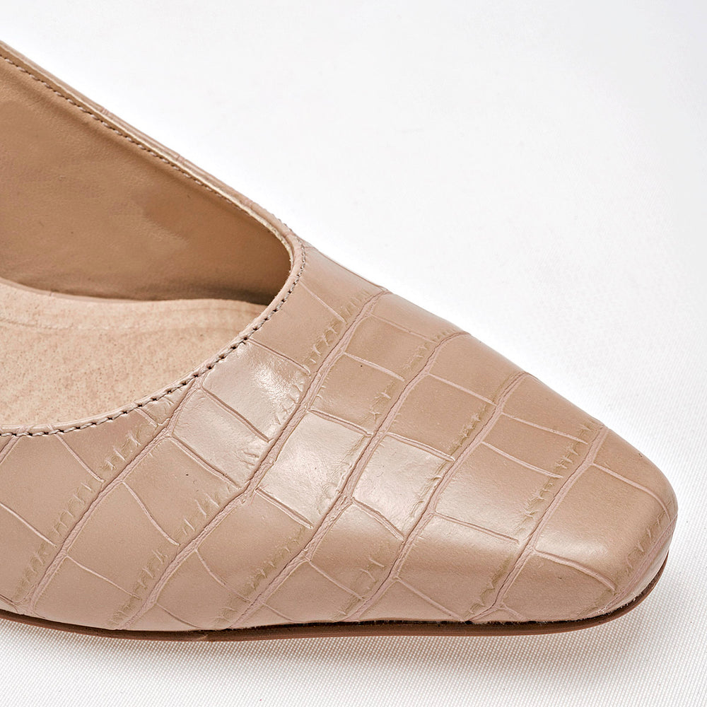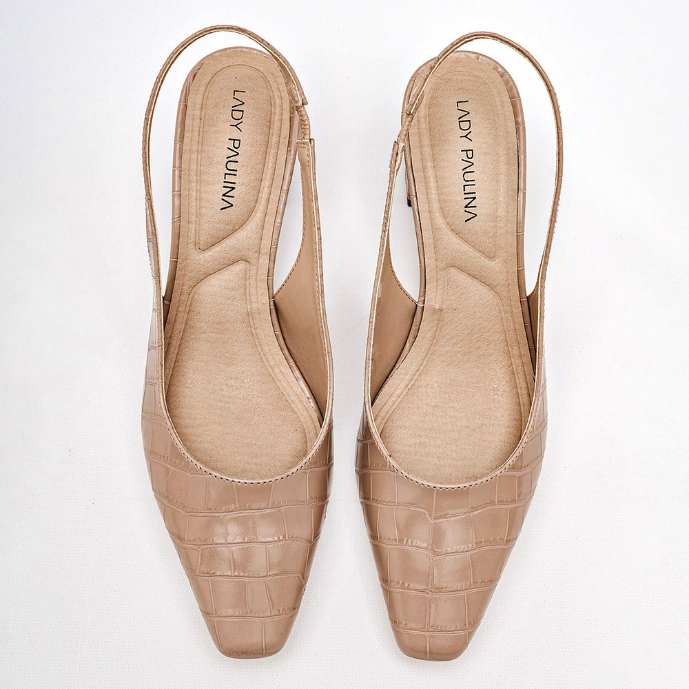 Este es un elegante y sofisticado zapato tipo slingback con tacón de bloque bajo, que presenta un diseño clásico con una textura moderna. El material principal es un sintético con un estampado o textura que imita la piel de cocodrilo, lo que le confiere un aspecto lujoso y de alta costura. Este acabado texturizado le da profundidad y un interés visual adicional. La característica distintiva es la correa elástica que rodea el talón, lo que permite un calce fácil y cómodo, manteniendo el pie en su lugar.