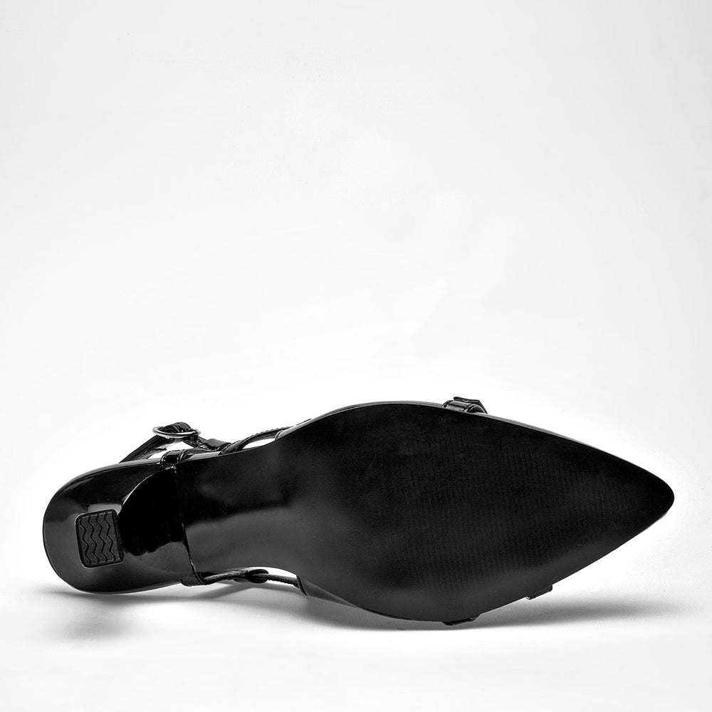 Zapato de tacón tipo "slingback" para mujer en color negro con acabado charol. Presenta una punta afilada y un tacón de 8 cm. El diseño se distingue por un conjunto de tiras cruzadas en el empeine con hebillas metálicas, que le dan un toque moderno y audaz.