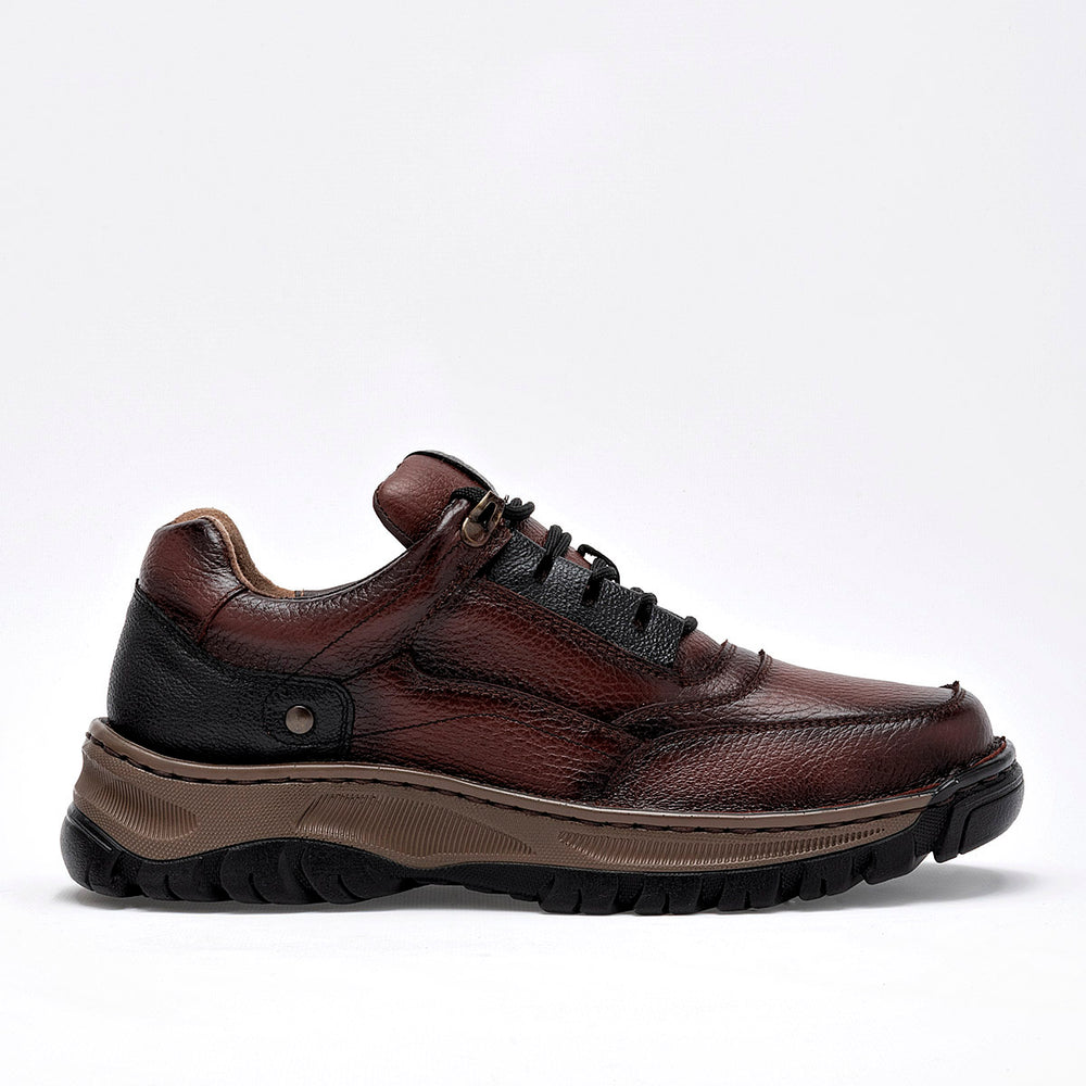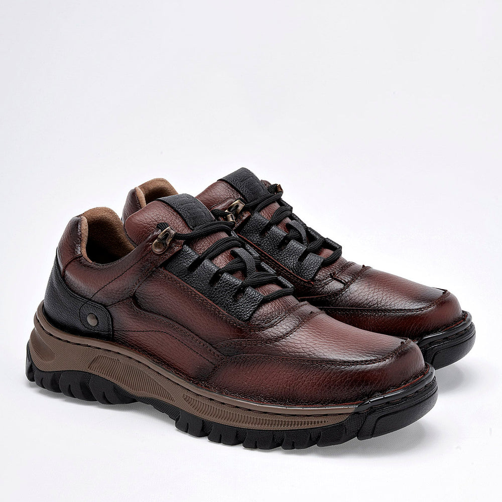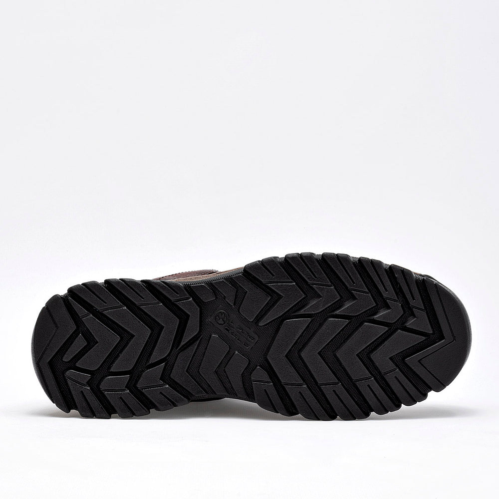Están fabricadas en cuero genuino de grano completo en un tono marrón oscuro, que presenta una textura distintiva y un acabado lustroso. La suela es gruesa y bicolor, con una entresuela en color café claro que proporciona una amortiguación notable y una suela exterior de goma negra, con un patrón de tacos profundos que garantizan una tracción excelente en diversas superficies.