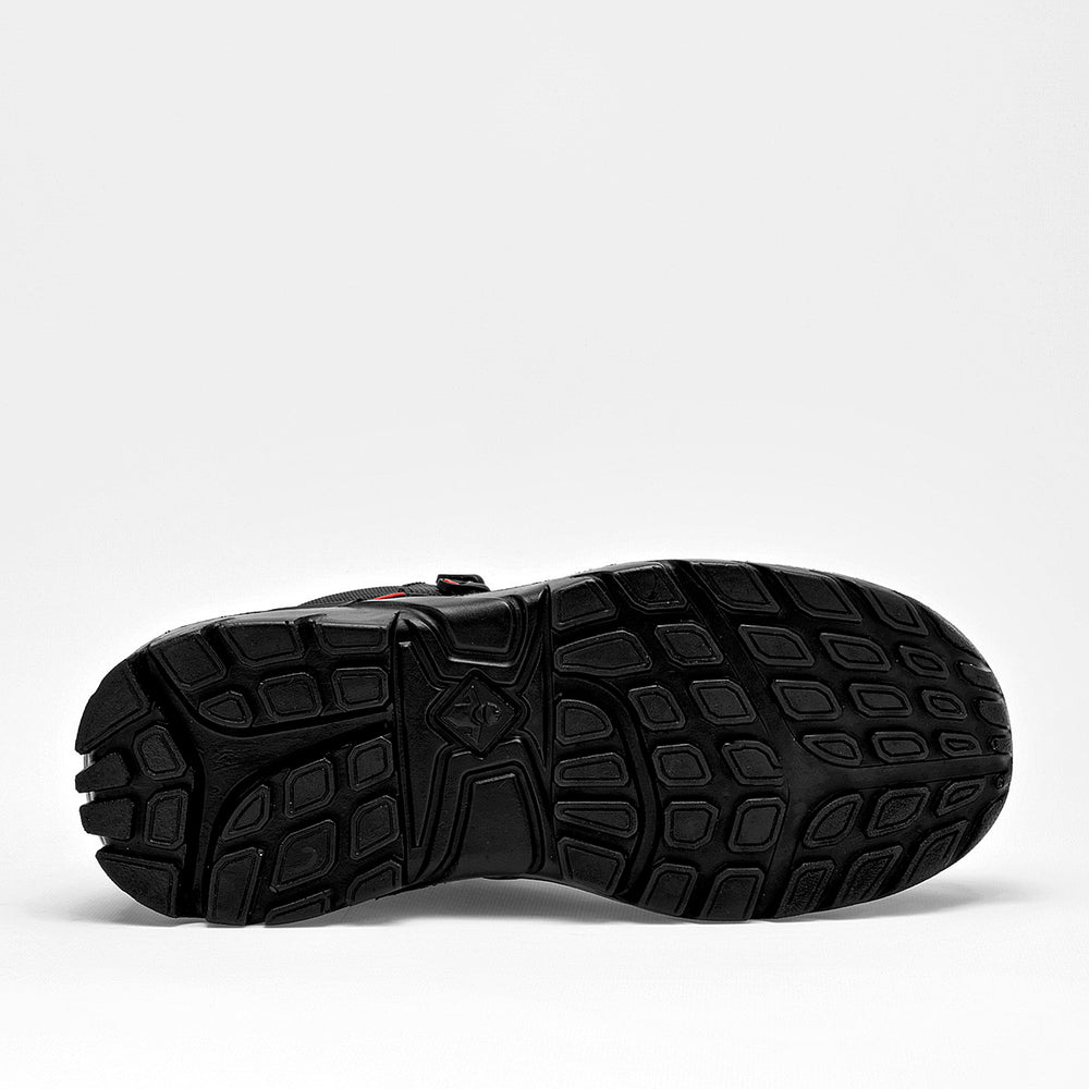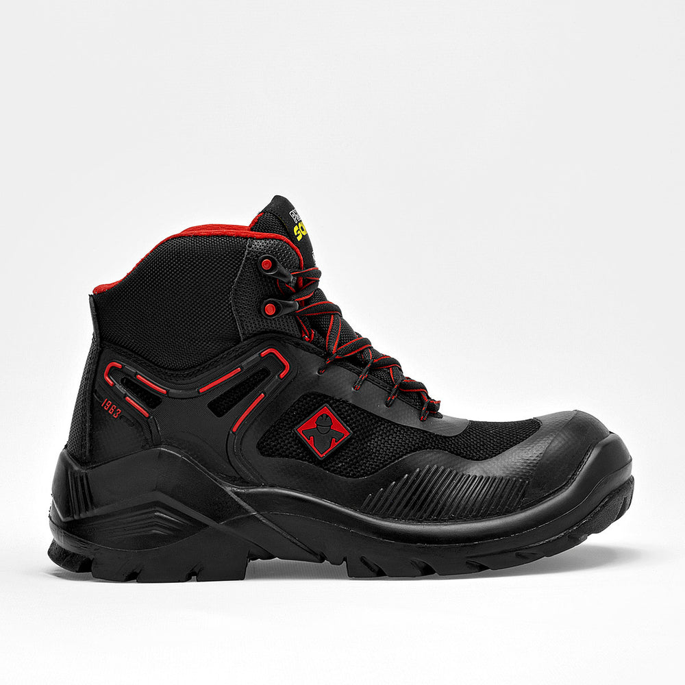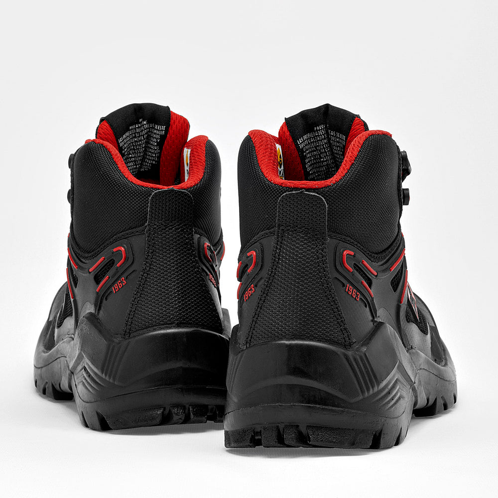 Está construida con un casco dieléctrico en la puntera, lo que la hace segura para entornos de trabajo donde existe riesgo eléctrico. La parte superior está hecha de una combinación de materiales sintéticos y malla textil de color negro, lo que la hace ligera y transpirable. Posee un sistema de cierre de cordones con ojales metálicos y elásticos en color rojo y negro. La suela es robusta y antideslizante, con un diseño de tacos profundos para una tracción superior.
