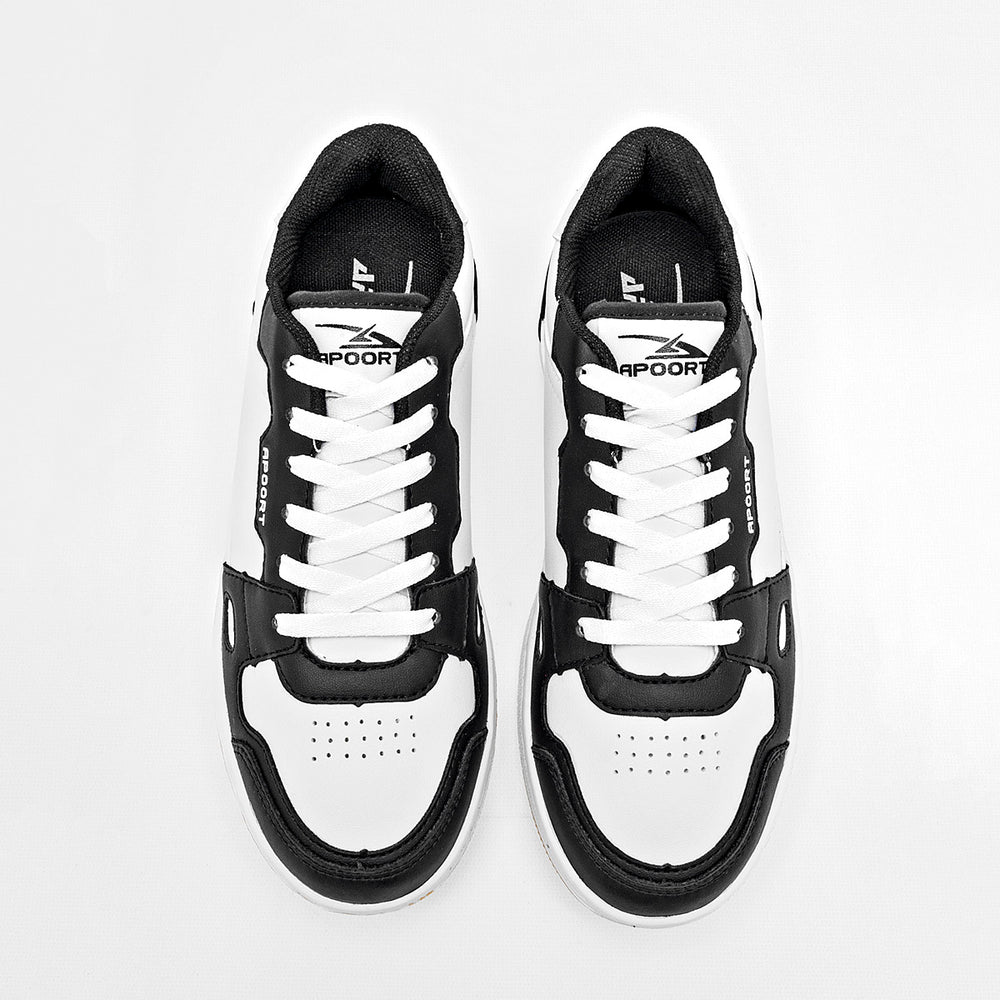 Tenis de corte bajo, con una combinación clásica de es y negro. Presenta un diseño de múltiples paneles de material sintético, con perforaciones en la parte superior. La suela es de con la parte inferior de goma de claro. Los cordones son s y la lengüeta tiene el logo de la "APOORT".
