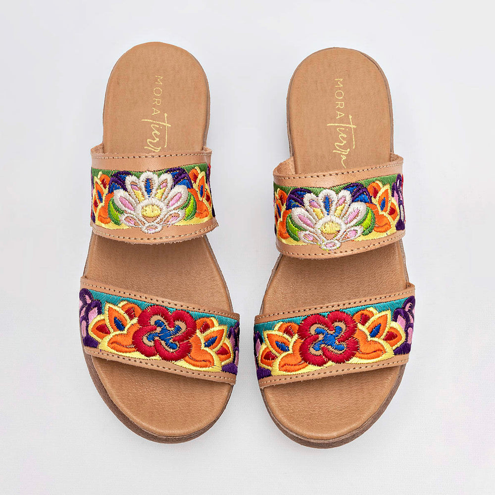Sandalia con un diseño que destaca por su artesanía. Están confeccionadas en un material de piel lisa. La parte superior está compuesta por dos tiras anchas adornadas con un bordado multicolor de estilo floral y bohemio, que aporta un toque de originalidad y color. La suela es de plataforma, con un tacón de 4 cm de altura, lo que estiliza la figura sin sacrificar comodidad.