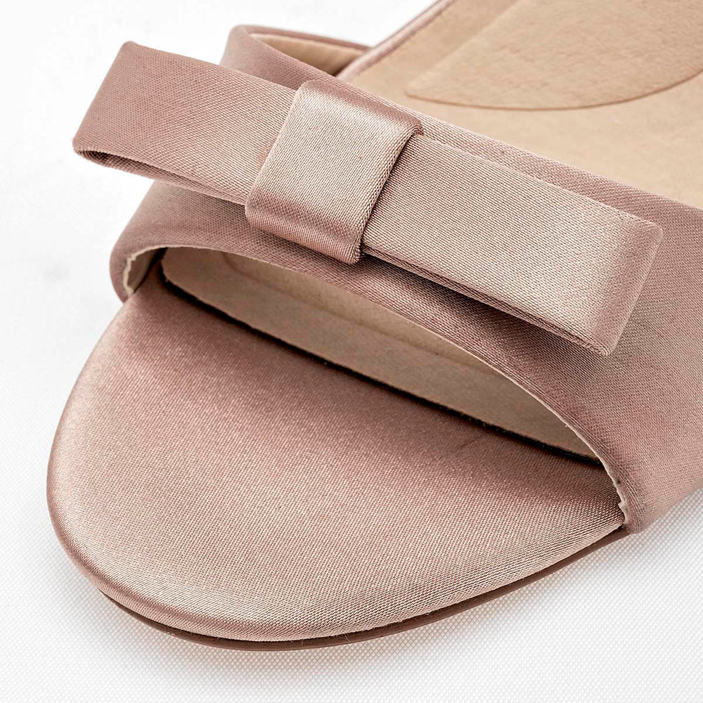 Fabricado en satín que le confiere un aspecto muy lujoso y festivo. El tacón tiene una altura de 10 cm, lo que lo posiciona como un zapato para ocasiones especiales donde se busca una elevación significativa y un efecto de alargamiento. Cuenta con una tira ancha que cruza la parte delantera del pie, está adornada con un delicado lazo plano aportando un toque de feminidad y dulzura al diseño.