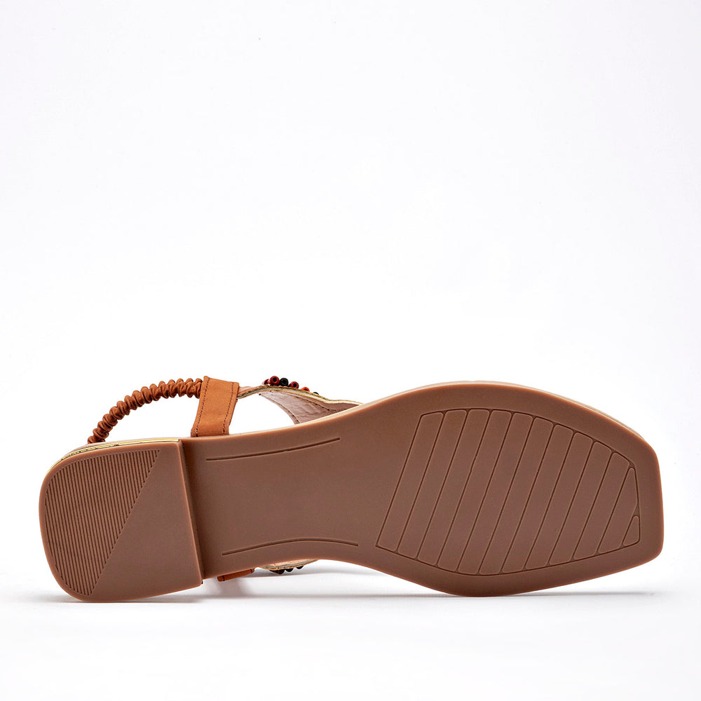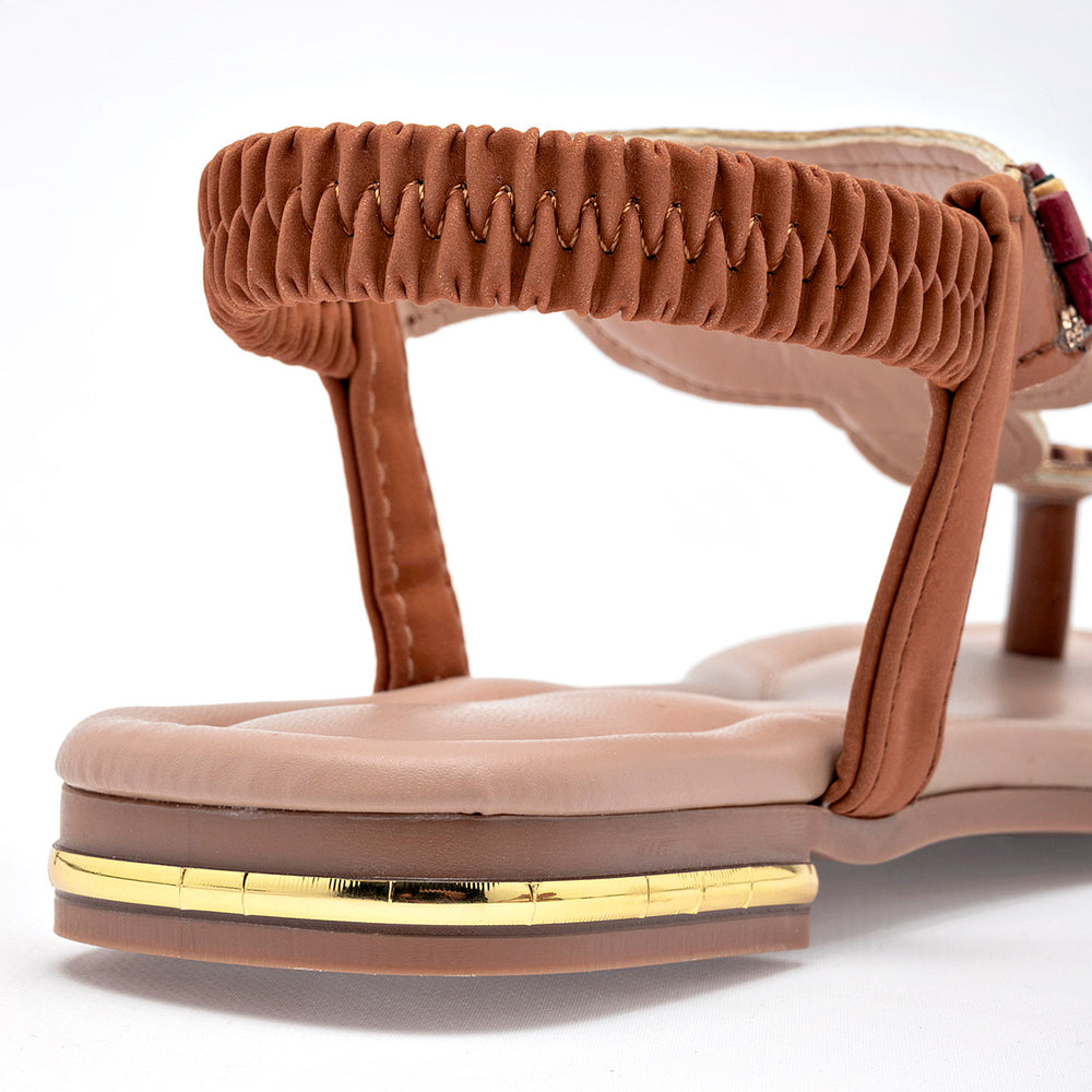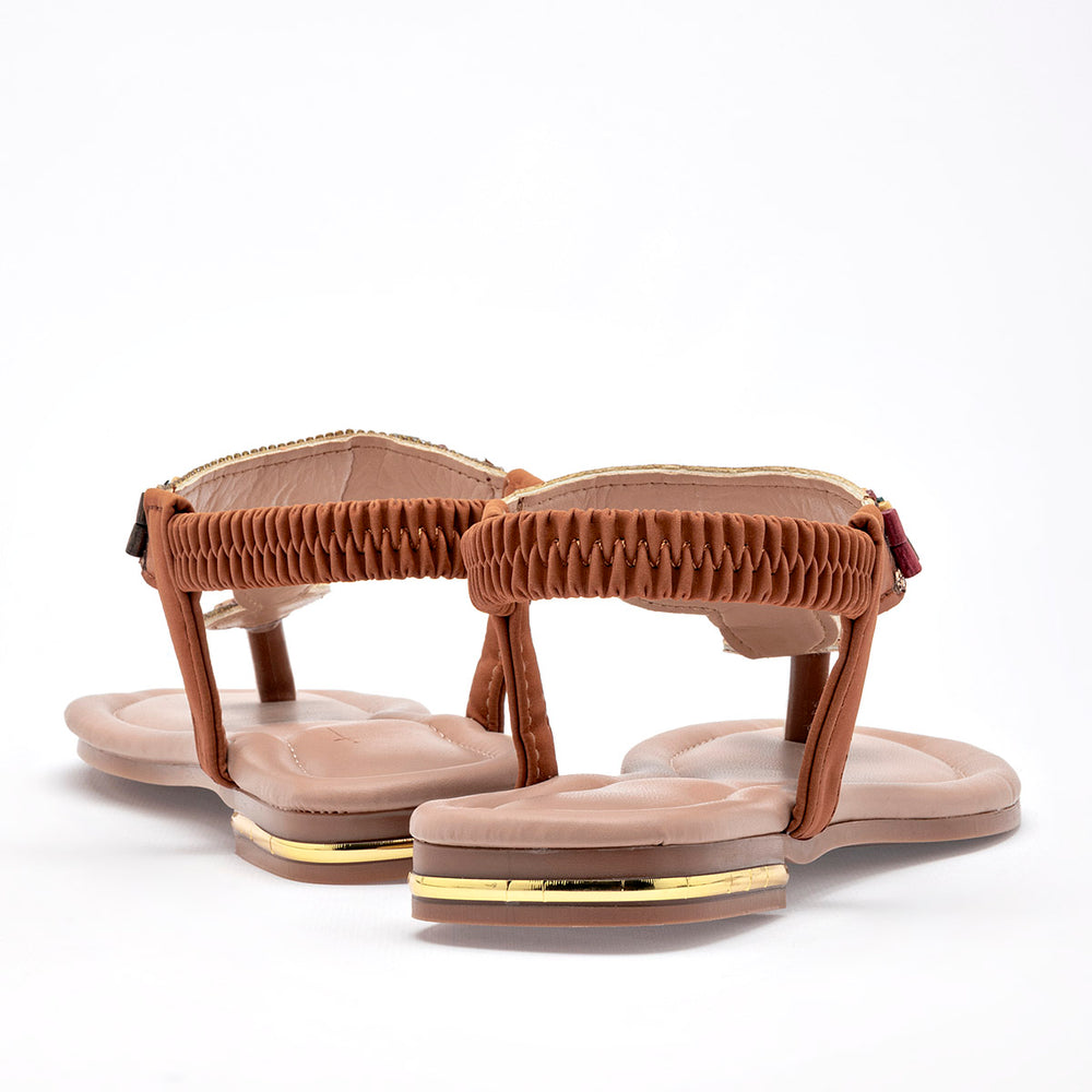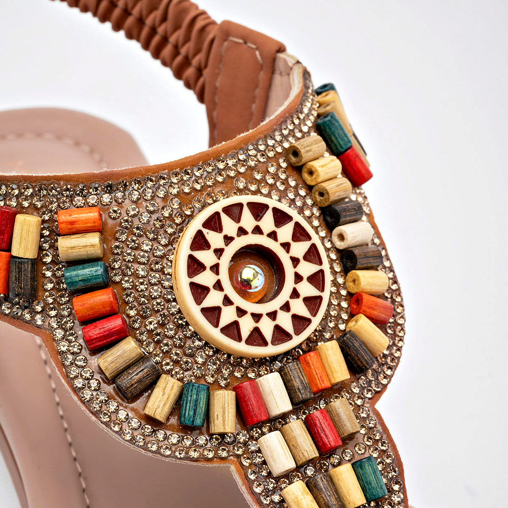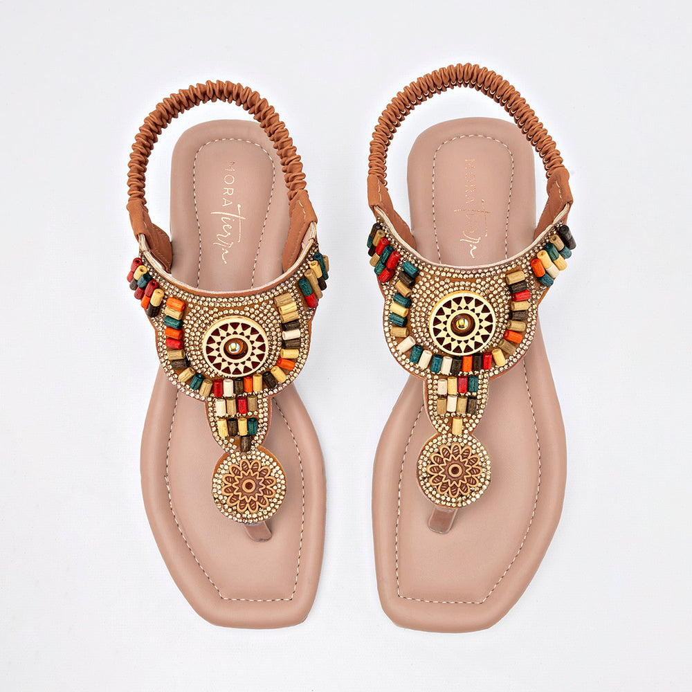 Sandalias de estilo romano con un diseño que destaca por sus elaborados adornos. El cuerpo principal es de un tono marrón claro y cuenta con una suela plana con un detalle metálico en la parte del tacón. La parte superior está compuesta por una correa central que se une a un adorno de pedrería multicolor y pequeñas cuentas, creando un diseño tribal y sofisticado. La sandalia se sujeta al tobillo con una banda elástica para un ajuste seguro.