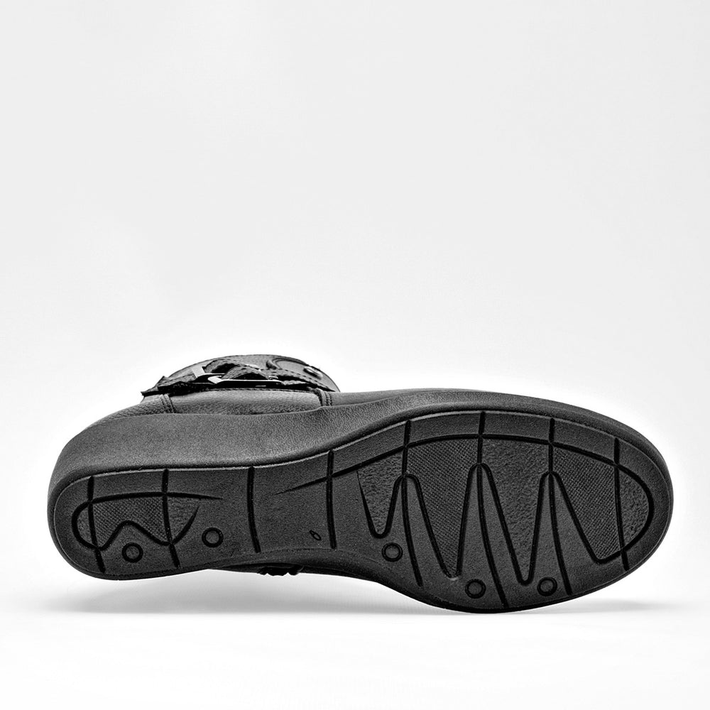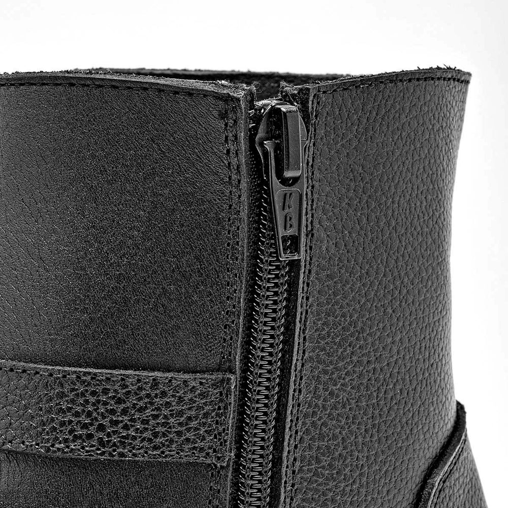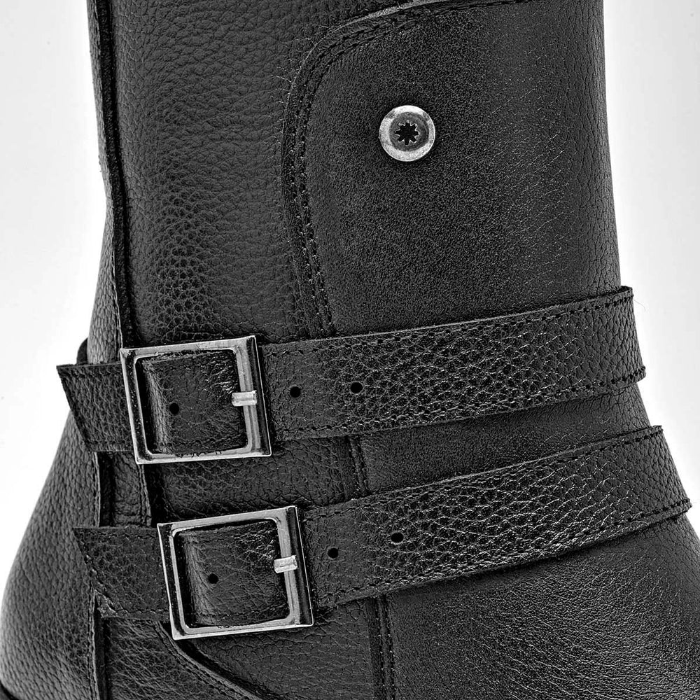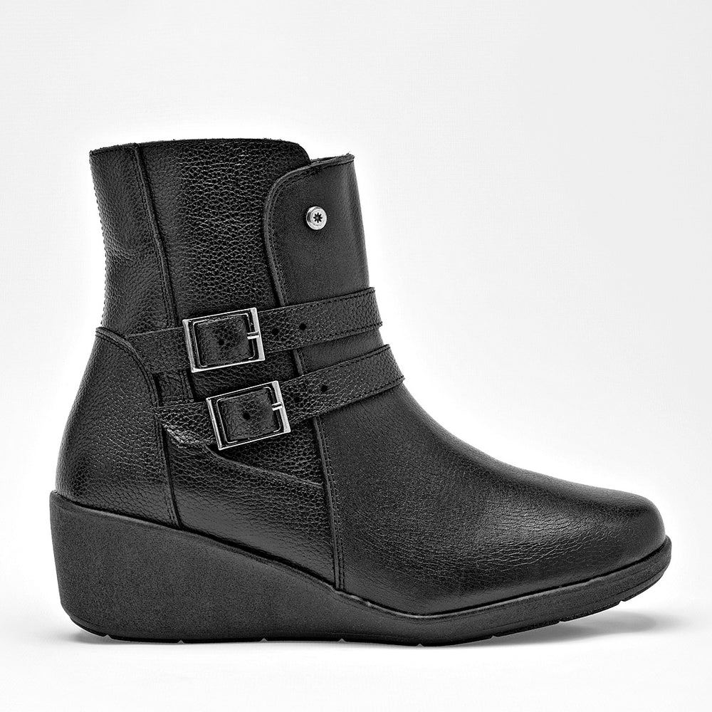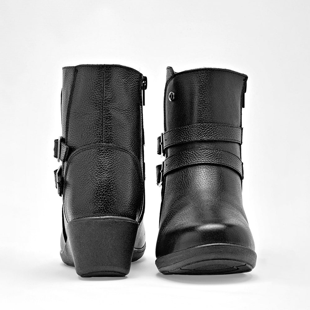 Este botín cuenta con una cómoda plataforma de 5 cm, que ofrece elevación sin comprometer la estabilidad y el confort al caminar. La parte superior presenta un acabado texturizado sutil, y está adornada con dos correas decorativas con hebillas metálicas que rodean el tobillo. Para un calce fácil y seguro, incorpora un práctico cierre de cremallera en el lateral.