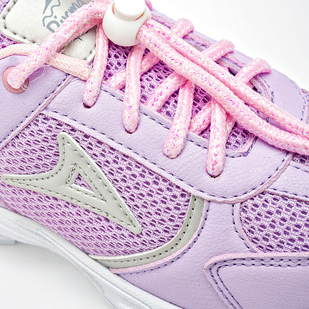 El calzado es de color lila y está fabricado con una combinación de malla transpirable y paneles de piel sintética. Los costados tienen un logo de la marca en un tono más claro, con un borde brillante. El talón presenta un detalle en color azul claro y en la parte trasera una correa de color gris para facilitar su colocación. Ajuste de cordones con un ajustador de plástico que elimina la necesidad de atar nudos. La suela es gruesa y de plataforma, de color blanco, con una textura que brinda buen agarre.