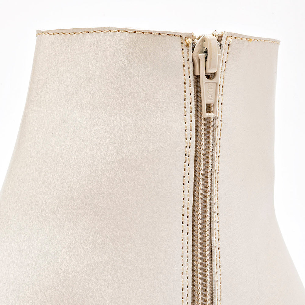 Este botín presenta un acabado liso que sugiere un material de alta calidad, similar al cuero. Su diseño de altura al tobillo es limpio y pulcro, con costuras discretas que resaltan su forma estructurada. Para un calce fácil y práctico, cuenta con un cierre lateral discreto que se integra perfectamente en el diseño. Descansa sobre un tacón ancho de 7 cm, que no solo proporciona una elevación significativa, sino que también ofrece estabilidad y comodidad al caminar.
