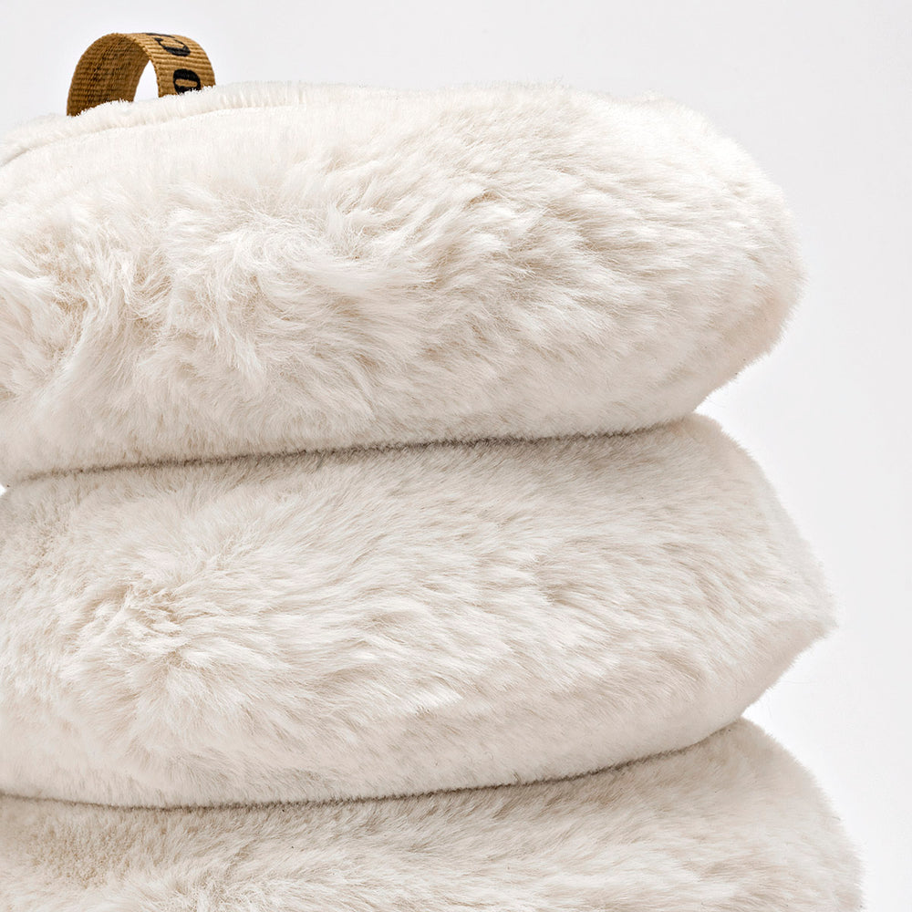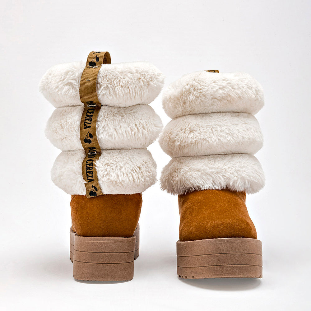 Bota de caña media y estilo invernal, confeccionado en material de gamuza. La parte superior de la caña está adornada con tres franjas de pelo sintético blanco y esponjoso. Cuenta con una plataforma de 4 cm con suela de relieve y tiene una trabilla trasero con el logo de la marca.
