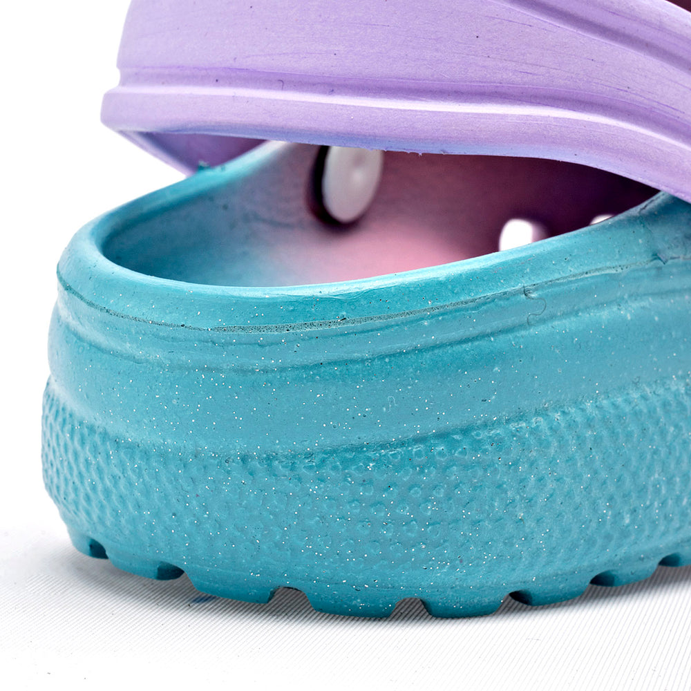 Es de un material de espuma, ligero y resistente al agua. Tiene orificios de ventilación en la parte delantera y una correa que se puede mover hacia adelante o atrás.