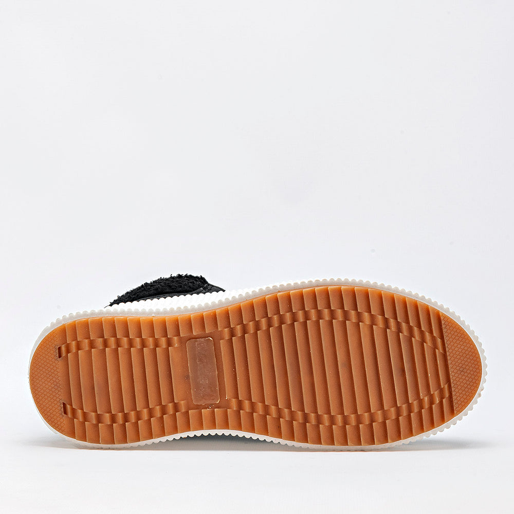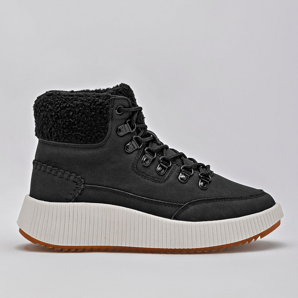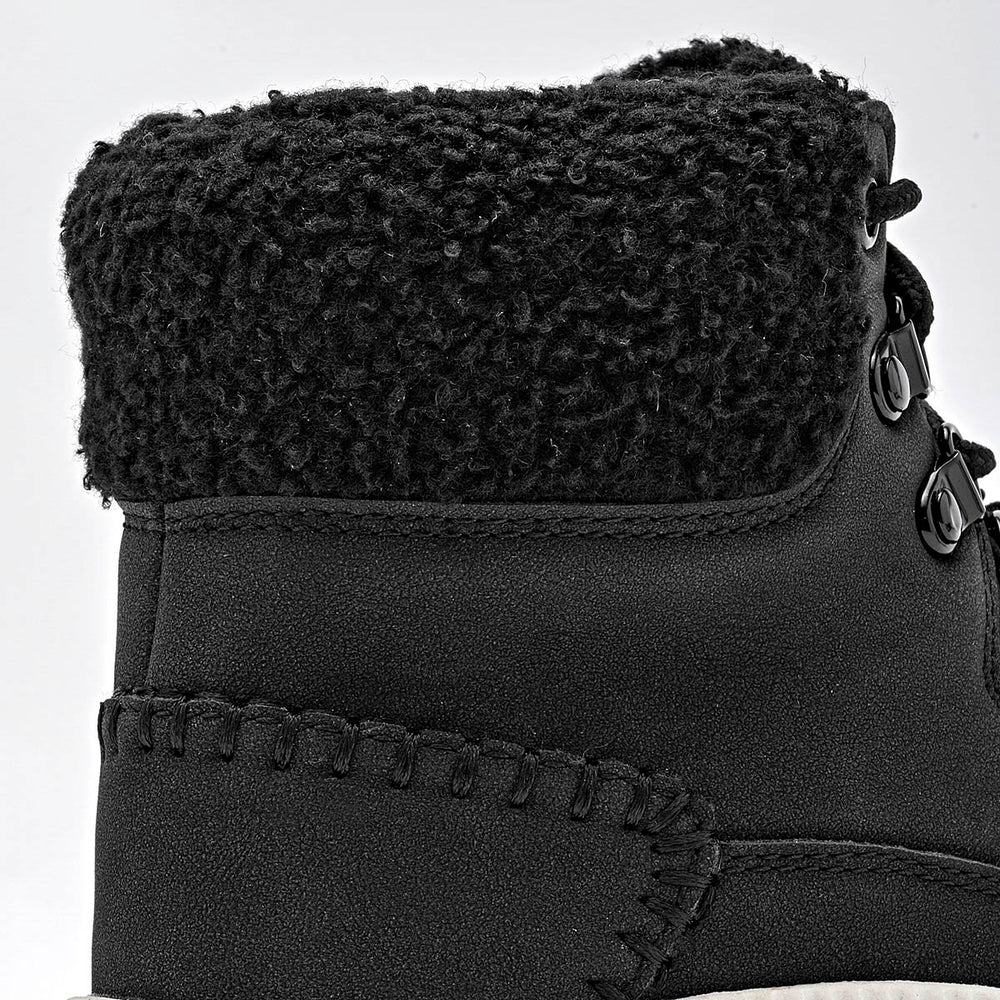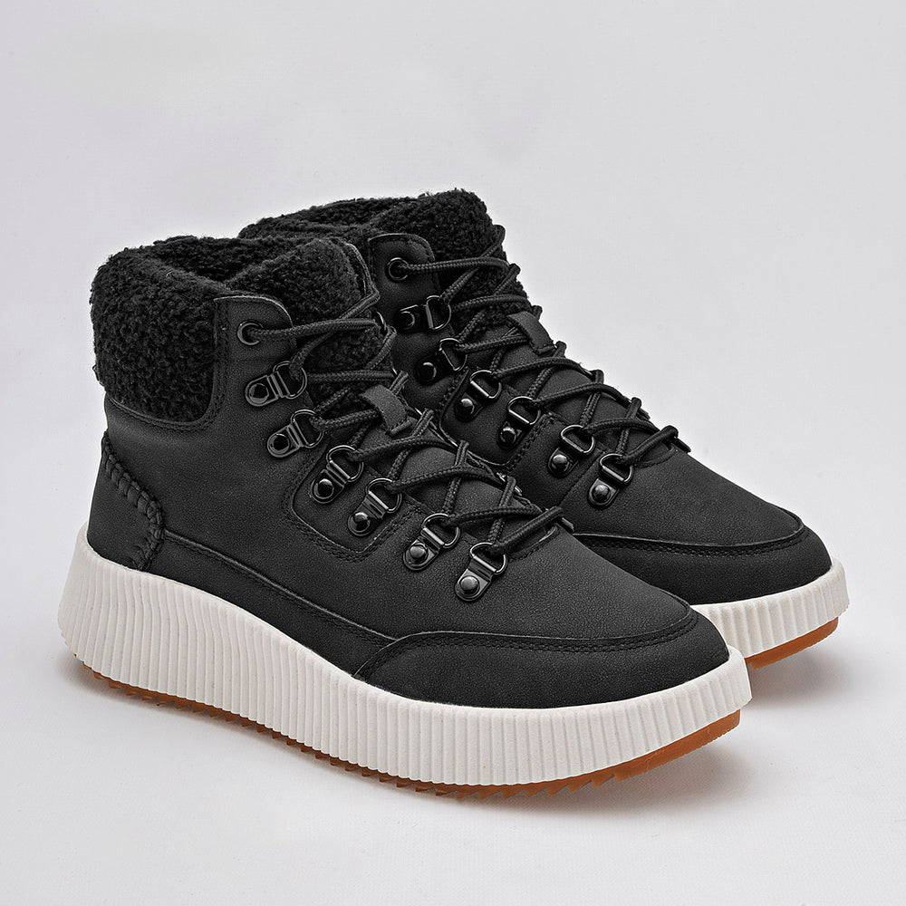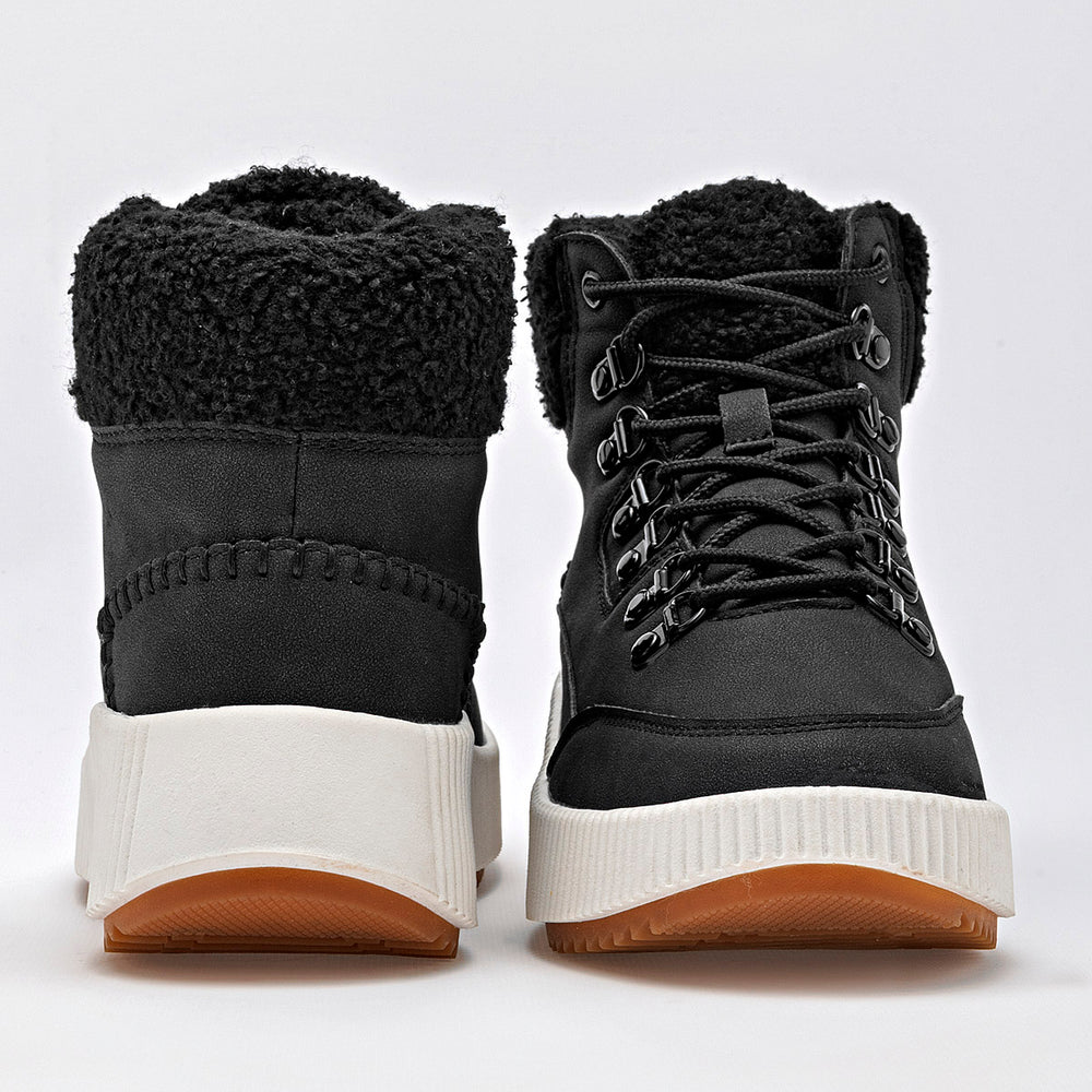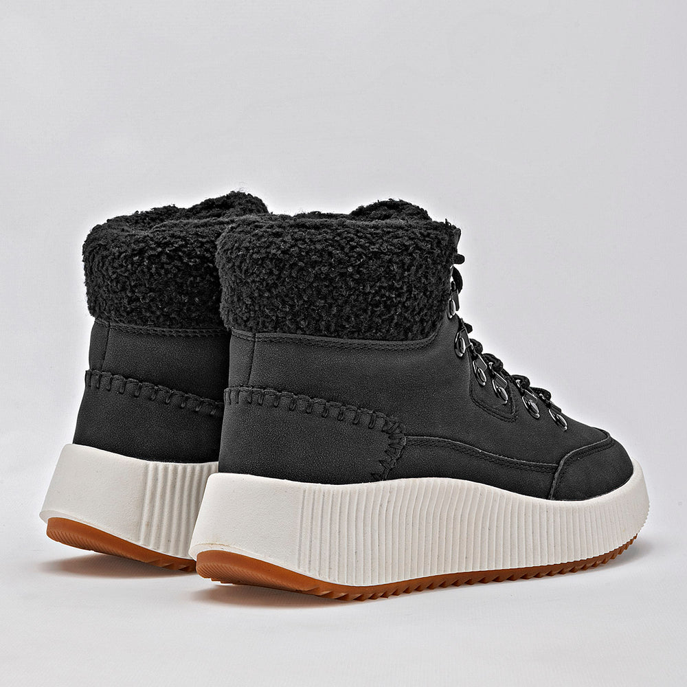 Estos son unos botines de estilo casual y moderno, ideales para el clima frío. La parte superior es de un elegante color negro, con un acabado que parece gamuza o nobuk sintético. La suela es robusta, de color blanco crema, con un diseño de plataforma gruesa y acanalada, que además tiene una suela exterior dentada para una mejor tracción. El cuello del botín está adornado con un forro de borrego sintético.