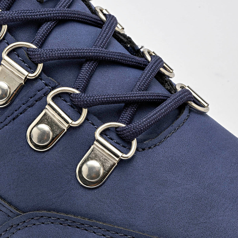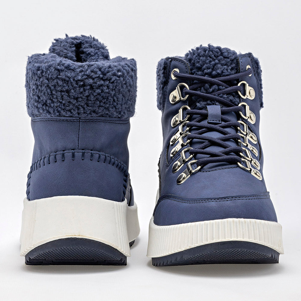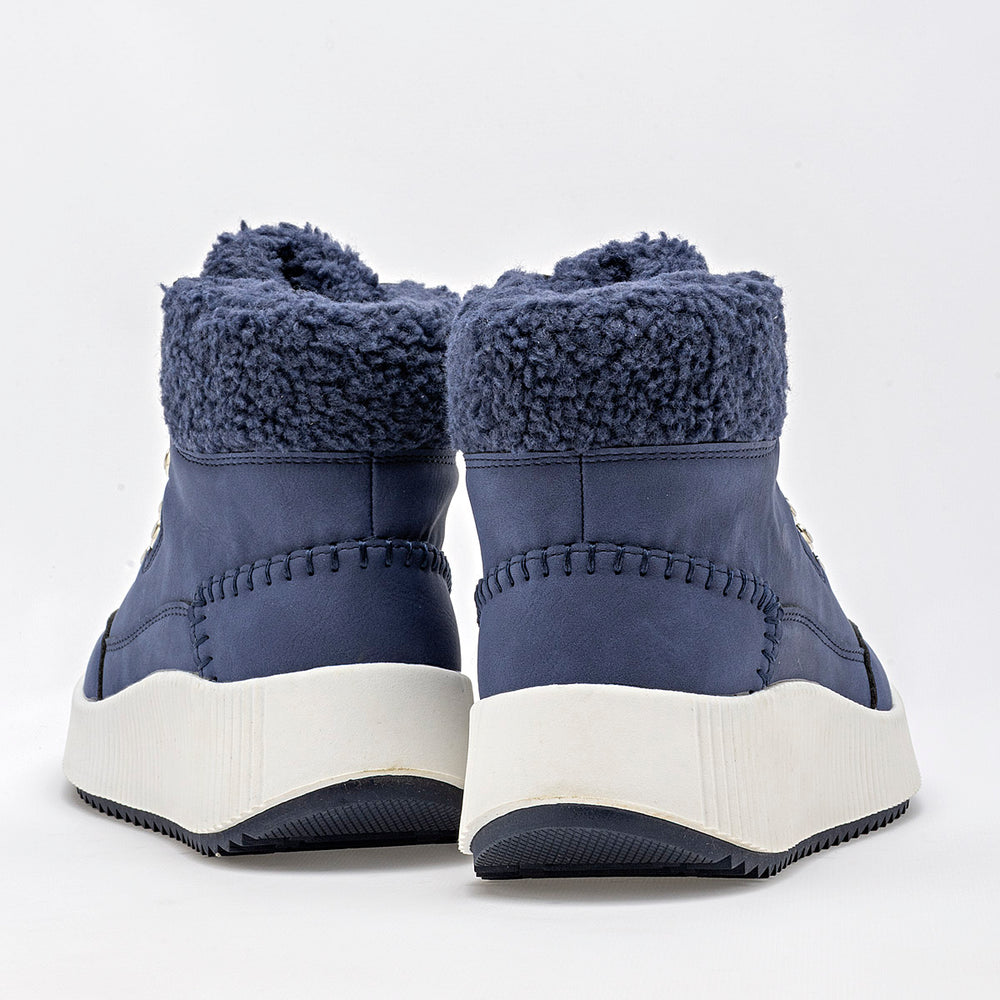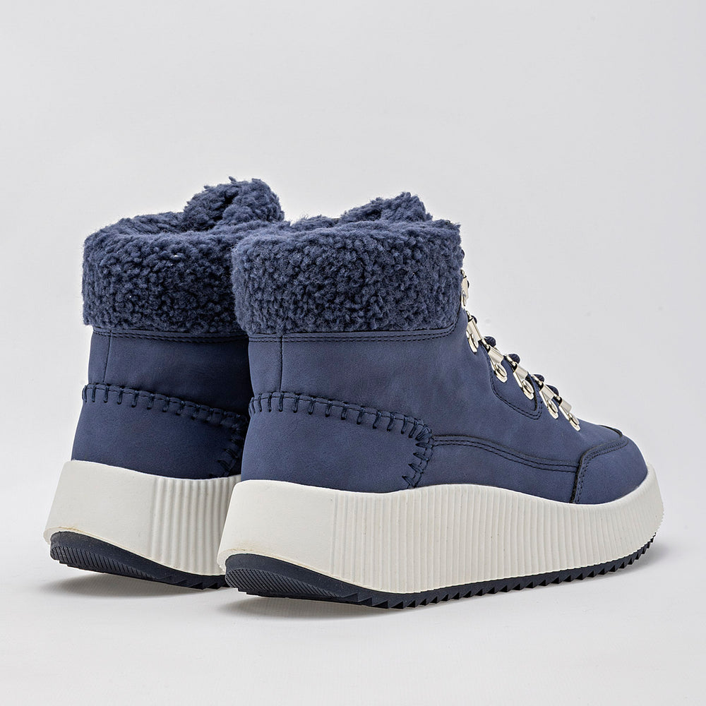 Estos son unos botines de estilo casual y moderno, ideales para el clima frío. La parte superior es de un elegante color azul marino, con un acabado que parece gamuza o nobuk sintético. La suela es robusta, de color blanco crema, con un diseño de plataforma gruesa y acanalada, que además tiene una suela exterior dentada para una mejor tracción. El cuello del botín está adornado con un forro de borrego sintético.