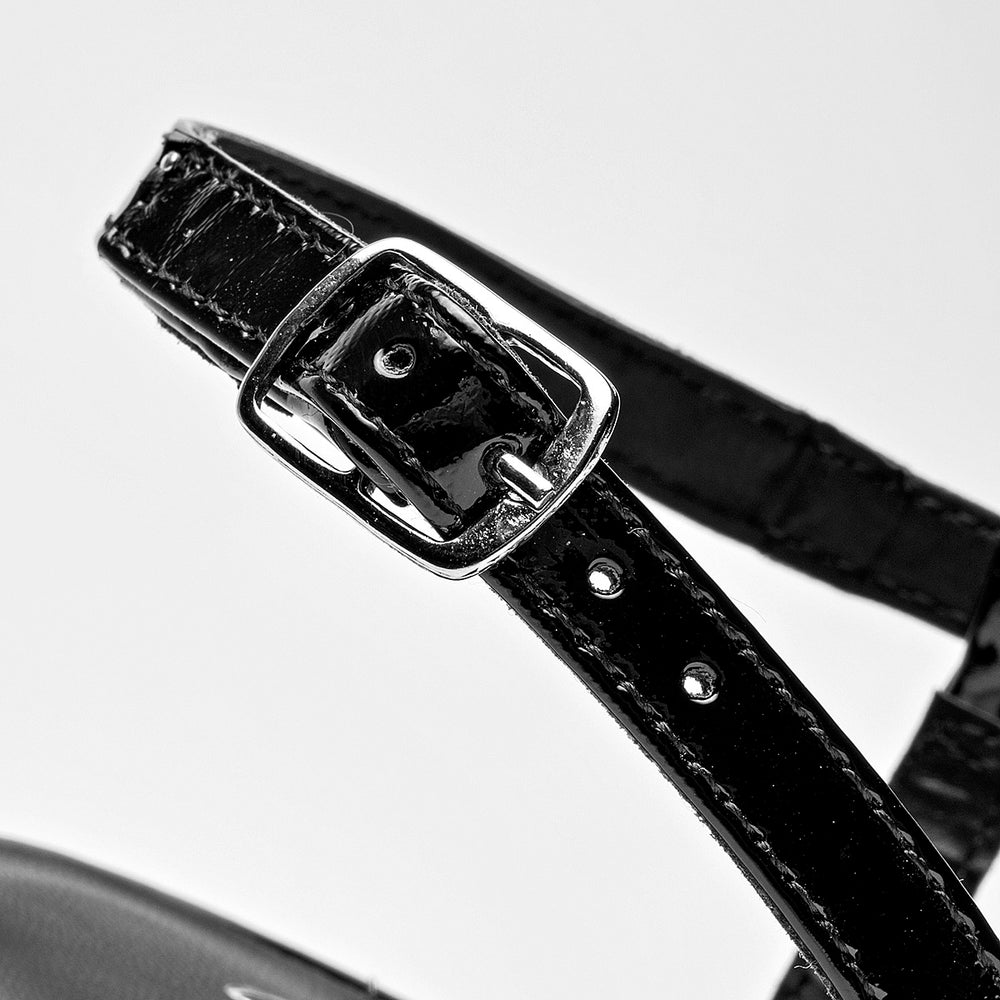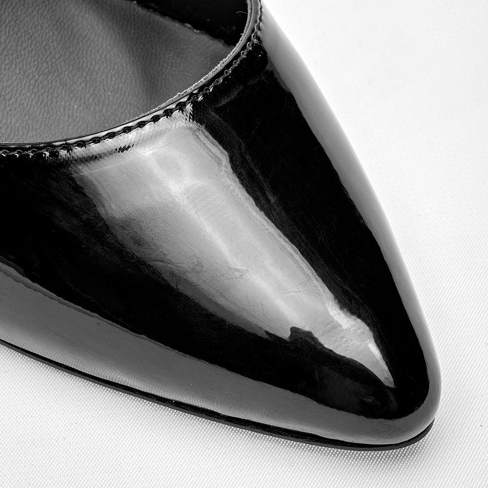 Zapatilla de tacón tipo aguja de 10 cm, en acabado de charol brillante. Este modelo destaca por su silueta de punta afilada y un diseño de tiras cruzadas en el empeine que se ajustan con una hebilla metálica en el tobillo, proporcionando un soporte adicional y un toque de sofisticación. El estilo de talón abierto y su acabado de alto brillo lo convierten en una pieza llamativa y elegante.