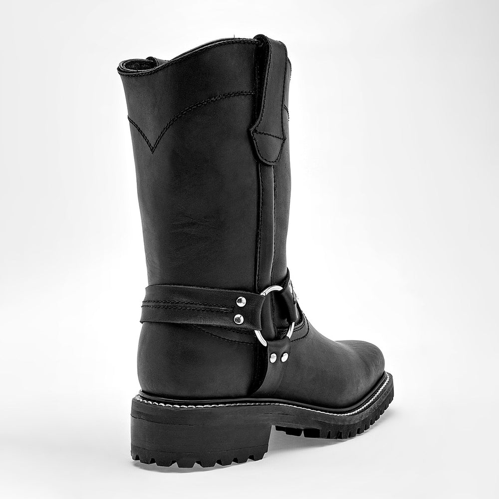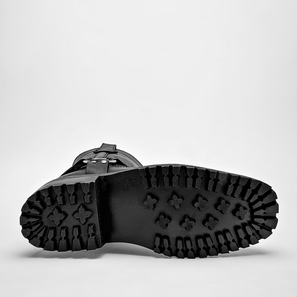 Fabricada en cuero o un material sintético de apariencia similar. Tiene un diseño robusto con una suela gruesa y antideslizante.