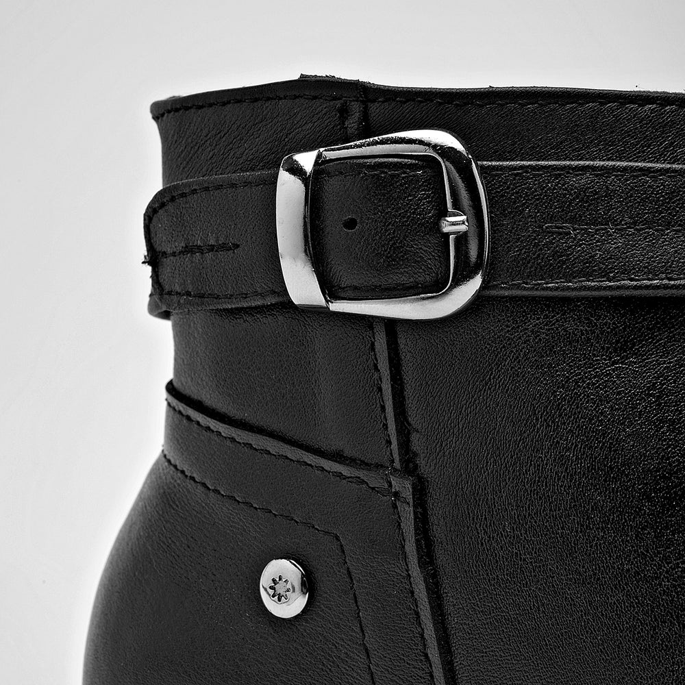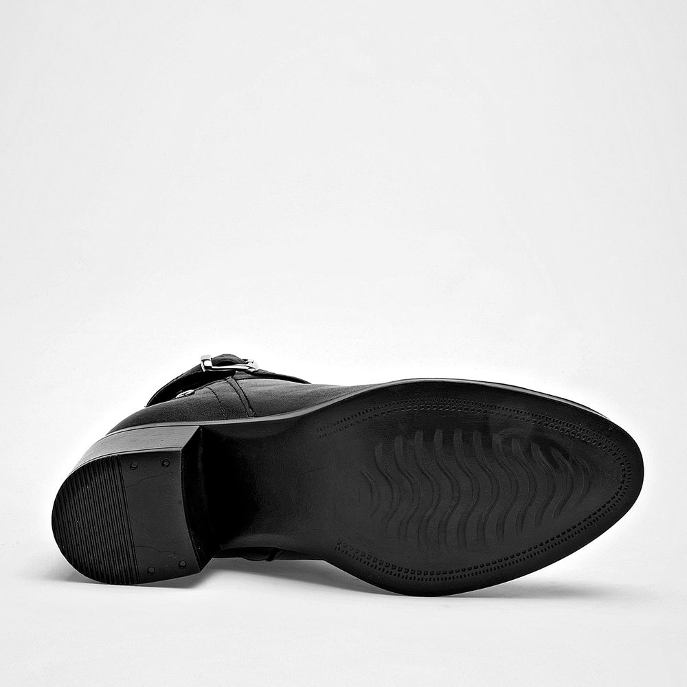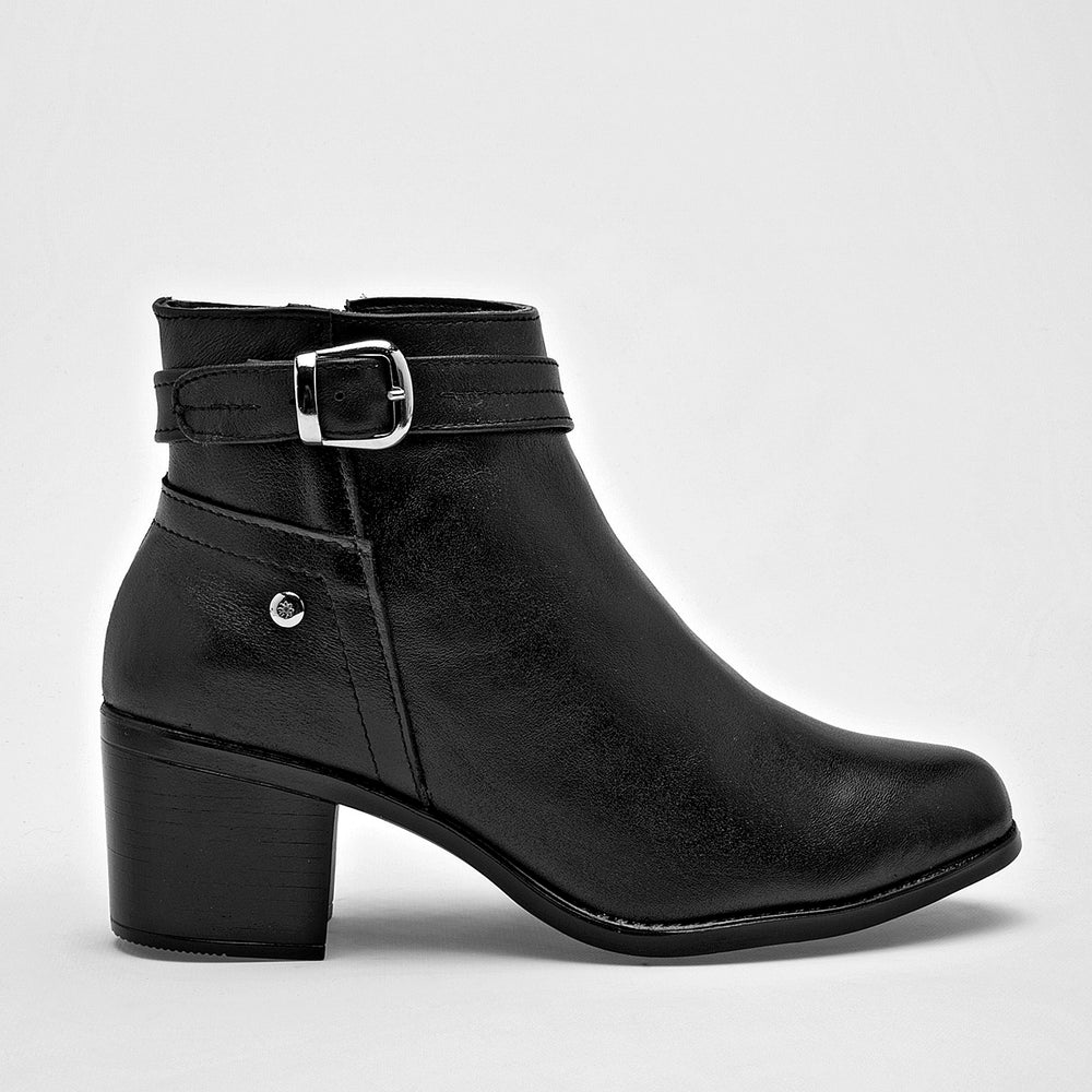 Este botín de piel cuenta con un tacón de 6 cm de altura, cierre lateral para facilitar su calce, y una correa decorativa con hebilla plateada que rodea el tobillo. El calzado presenta un acabado liso y un diseño clásico de botín.