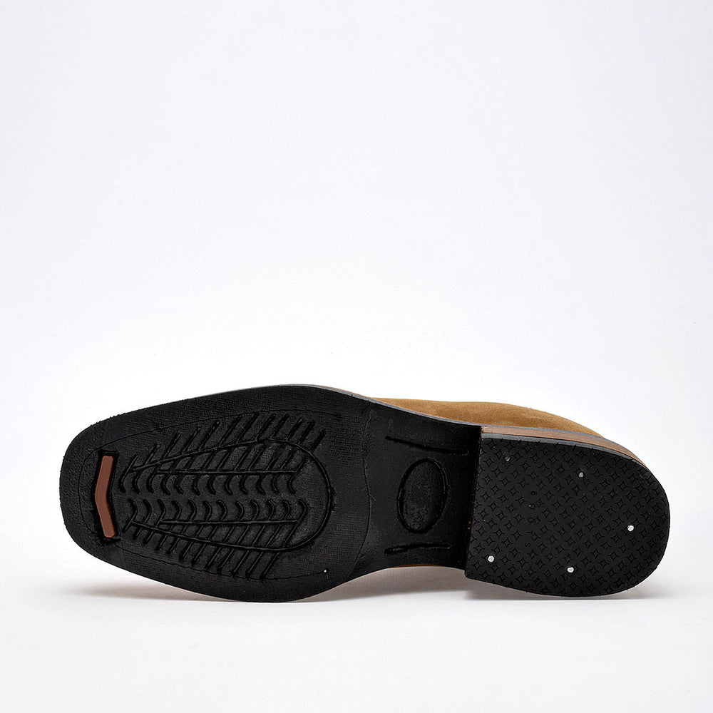 El material es de gamuza, con un acabado suave. Presenta un diseño simple con costuras decorativas en en el empeine y un tacón bajo.