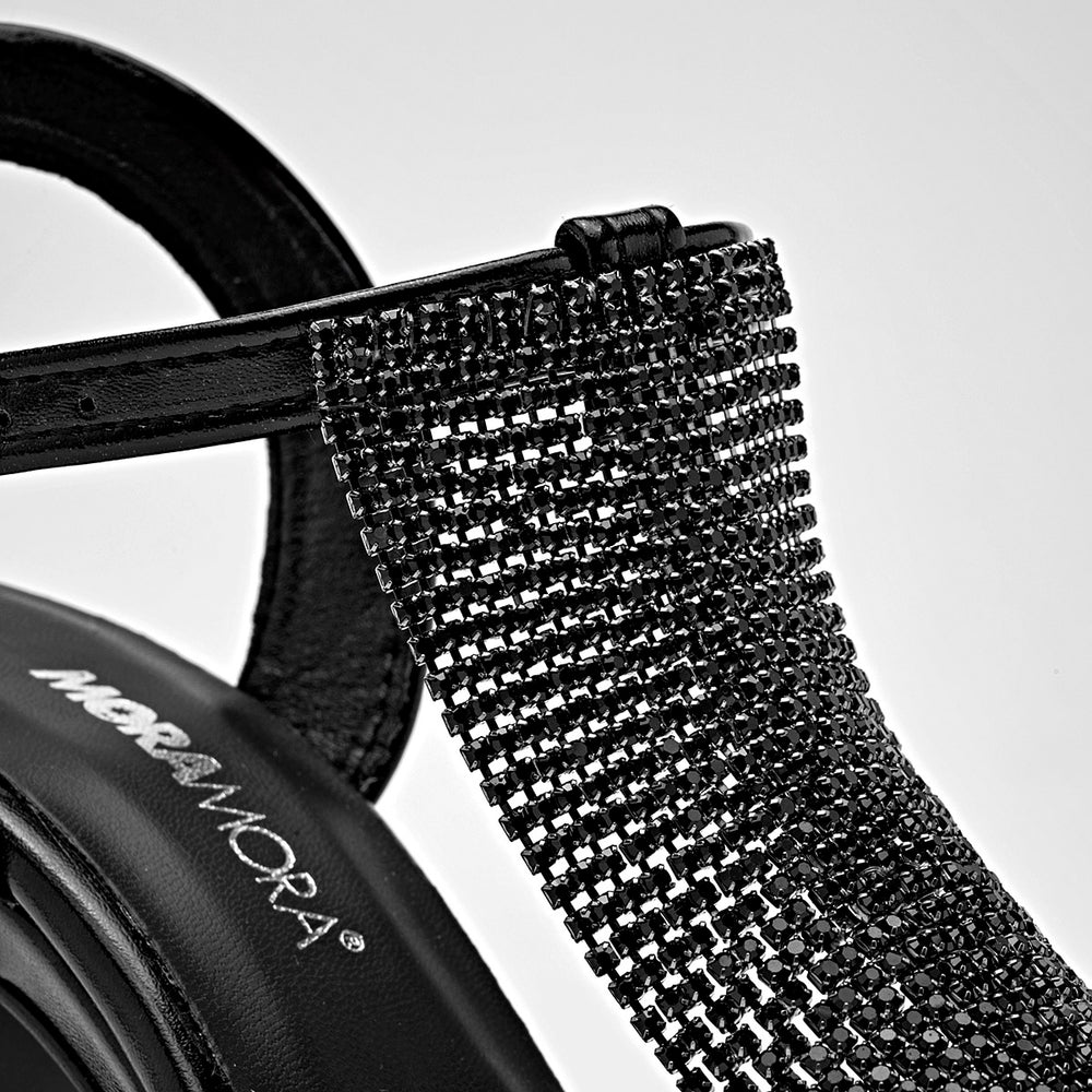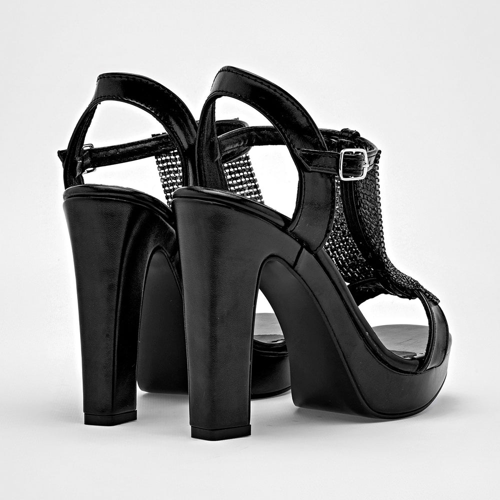 Zapatilla de tacón para mujer en color negro, con una plataforma delantera y un tacón ancho de 11 cm . El diseño se distingue por una cascada de cadena negra sobre el empeine y una tira ajustable al tobillo, que le dan un toque moderno y audaz.