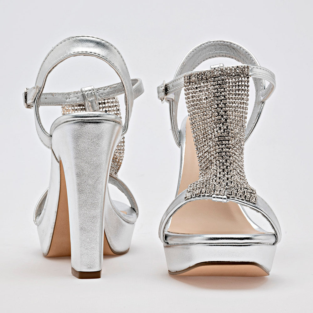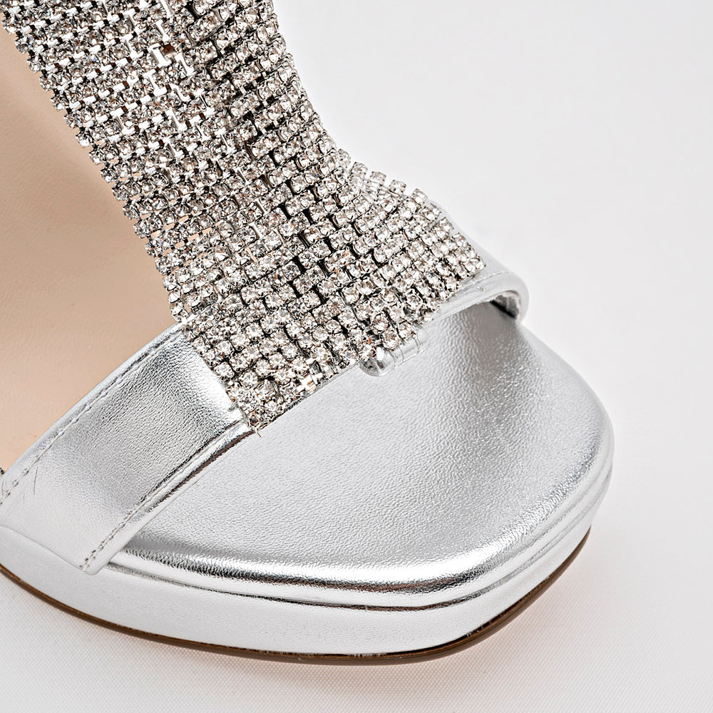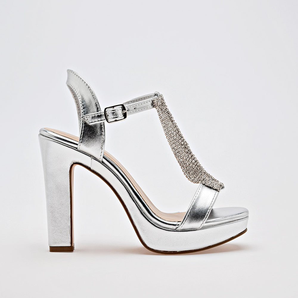 Zapatilla de tacón en color plata, con una plataforma delantera y un tacón ancho de 11 cm . El diseño se distingue por una cascada de cadena color plata sobre el empeine y una tira ajustable al tobillo, que le dan un toque moderno y audaz.