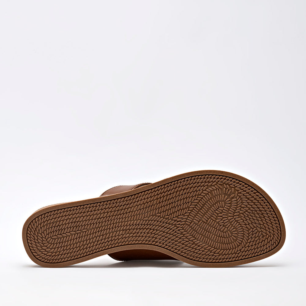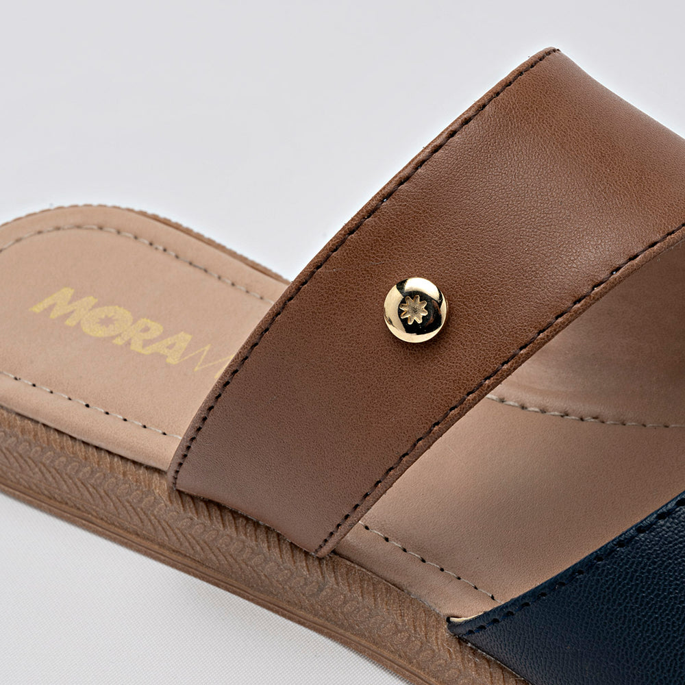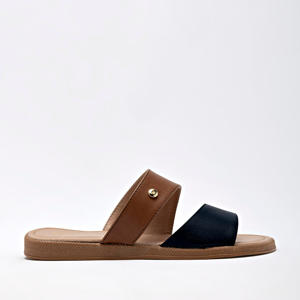 Sandalias de estilo pala, con un diseño moderno y minimalista que combina dos colores. La suela es plana, con una base en un tono beige claro que ofrece comodidad y ligereza. La parte superior está compuesta por dos tiras anchas, una en un tono marrón claro y la otra en azul marino, creando un atractivo contraste. Un pequeño broche metálico en la tira superior añade un detalle de calidad. El diseño es abierto, lo que las hace fáciles de poner y quitar.