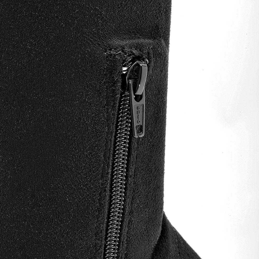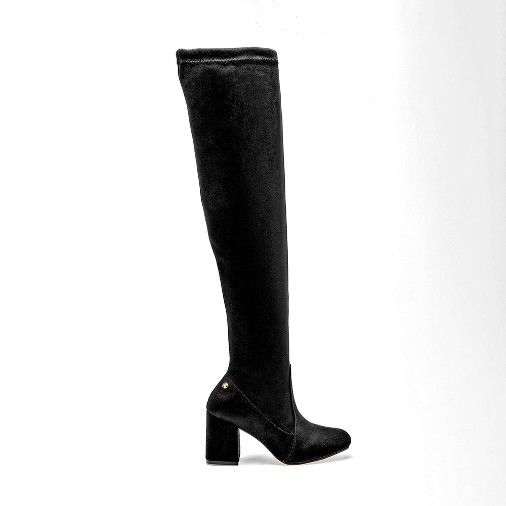 Esta es una bota alta que combina un diseño moderno y sensual con la elegancia de un tacón de bloque. Su estética es atrevida y sofisticada. El material es de microfibra de gamuza sintética, que se ajusta perfectamente a la pierna, creando una silueta esbelta y ceñida desde el muslo hasta el tobillo. La bota tiene un tacón de bloque robusto y estable con una altura de 8 cm, proporciona una elevación considerable, pero su grosor lo hace mucho más cómodo y seguro para caminar.