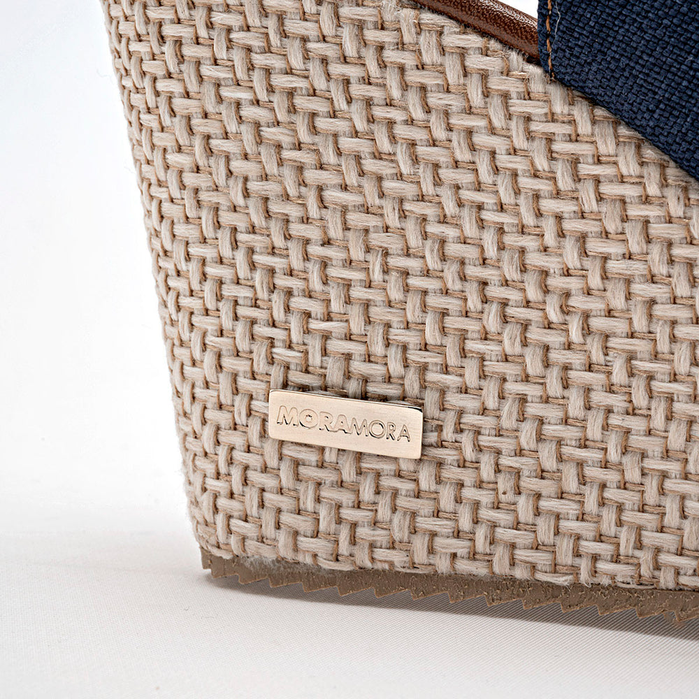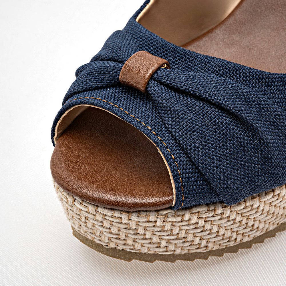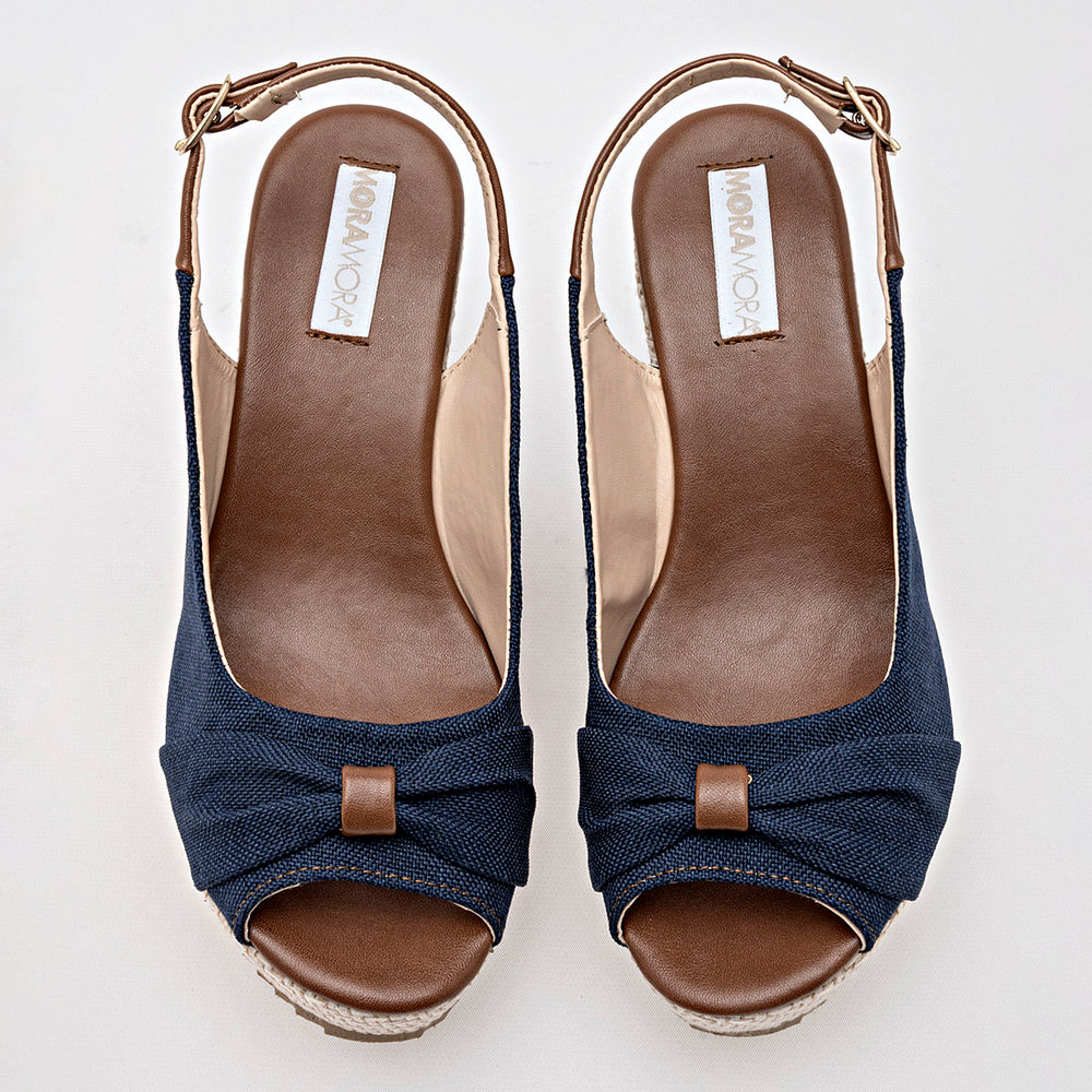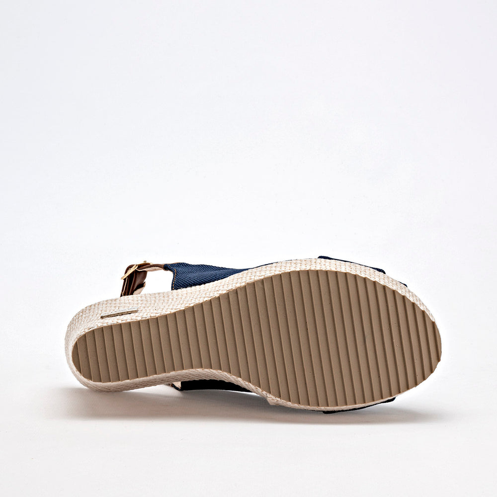 La sandalia presenta una punta abierta y un diseño frontal con nudo decorativo hecho con el mismo material de lona azul, que le da un toque femenino y distintivo. Se sujeta al pie con una correa ajustable en el tobillo, con una hebilla metálica dorada que no solo asegura un buen ajuste, sino que también añade un detalle elegante. La característica principal es su tacón tipo cuña con una altura de 9 cm, proporciona una elevación significativa que estiliza la figura.