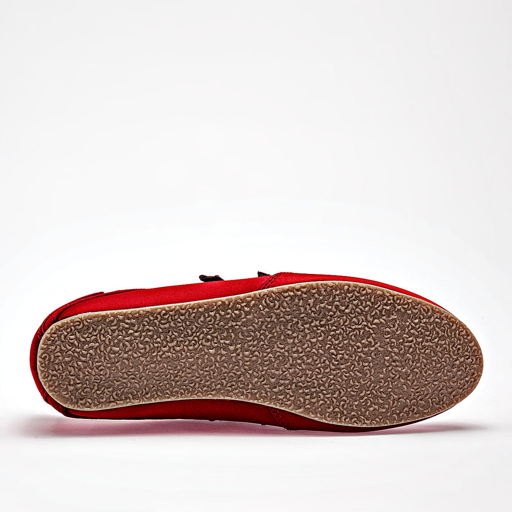 Zapato casual tipo flat o bailarina deportiva en un vibrante color rojo satín. El diseño cuenta con una estructura de perfil bajo y estilizado, confeccionado en un material textil suave con un ligero brillo. Destaca por su sistema de ajuste mediante dos correas delgadas con cierre de contacto (velcro) sobre el empeine y un pequeño detalle metálico decorativo en el lateral del talón. Posee una suela de goma delgada y flexible en color caramelo, ideal para un movimiento natural del pie.