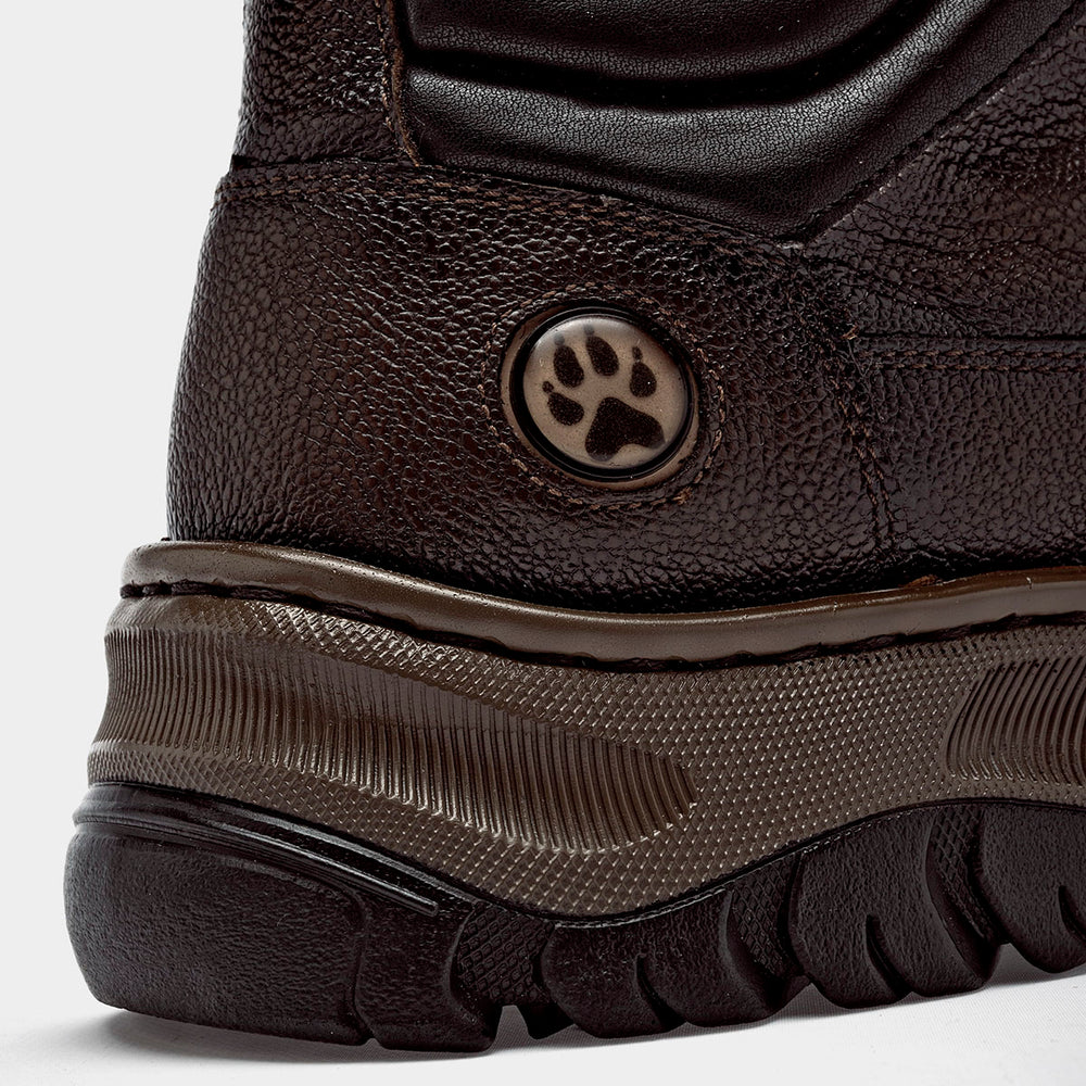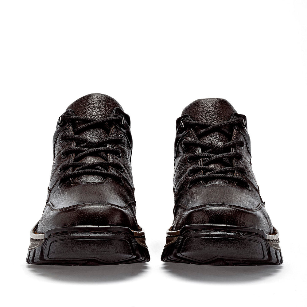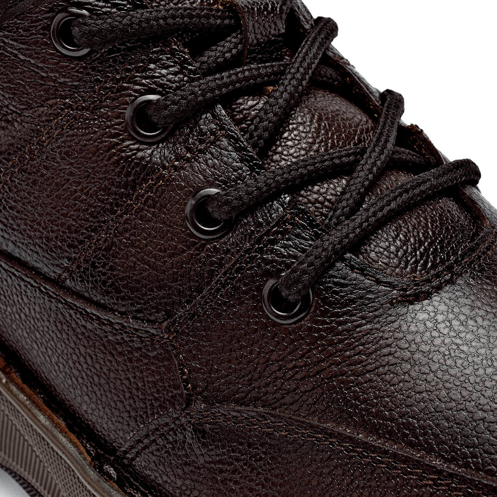Zapato de media caña tipo "hiker" en color marrón oscuro con una textura granulada resistente. El diseño destaca por su robustez, incorporando un cuello acolchado en color negro para mayor protección del tobillo y un sistema de cordones redondos reforzados. Presenta costuras tonales discretas, un logotipo circular grabado en el lateral del talón y una suela track de goma en color café con relieves profundos, diseñada para ofrecer durabilidad y un agarre firme en superficies variadas.