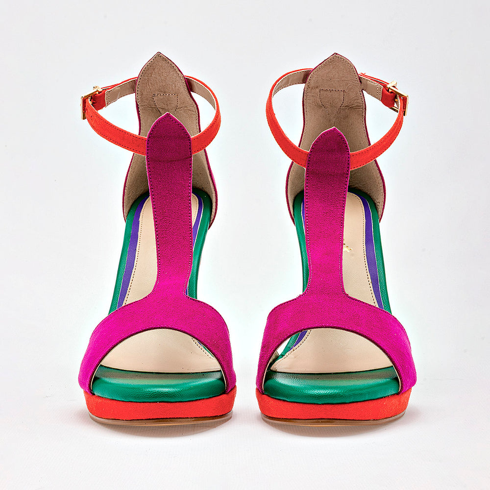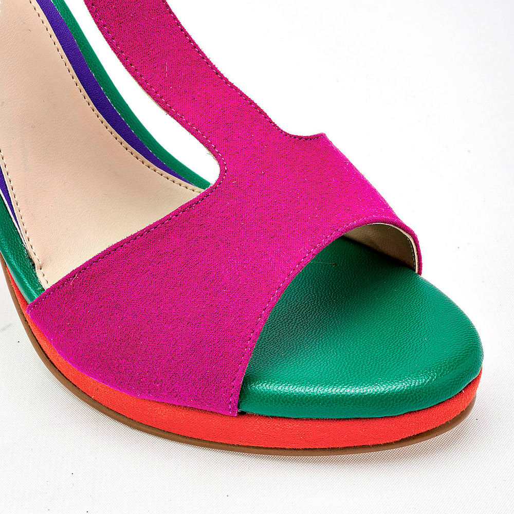 Sandalia de tacón alto y plataforma que destaca por su vibrante diseño color-block y su silueta estilizada, Presenta una elegante estructura en "T" confeccionada en material textil tipo gamuza de color fucsia intenso. El diseño juega con una paleta audaz que incluye un talón y tacón en color naranja vibrante, mientras que la plantilla y el borde interior son de un verde esmeralda contrastante.