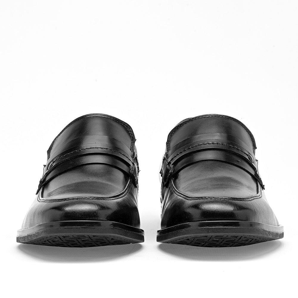 Zapato de vestir estilo mocasín (Penny Loafer) en color negro con un acabado pulido de alto brillo. El diseño presenta una elegante puntera cuadrada con costura de realce que le otorga una silueta estructurada. Incluye una banda transversal sobre el empeine decorada con un discreto remache metálico lateral, un perfil esbelto de costados lisos y una suela formal oscura con tacón bajo que complementa su estética sobria y distinguida.