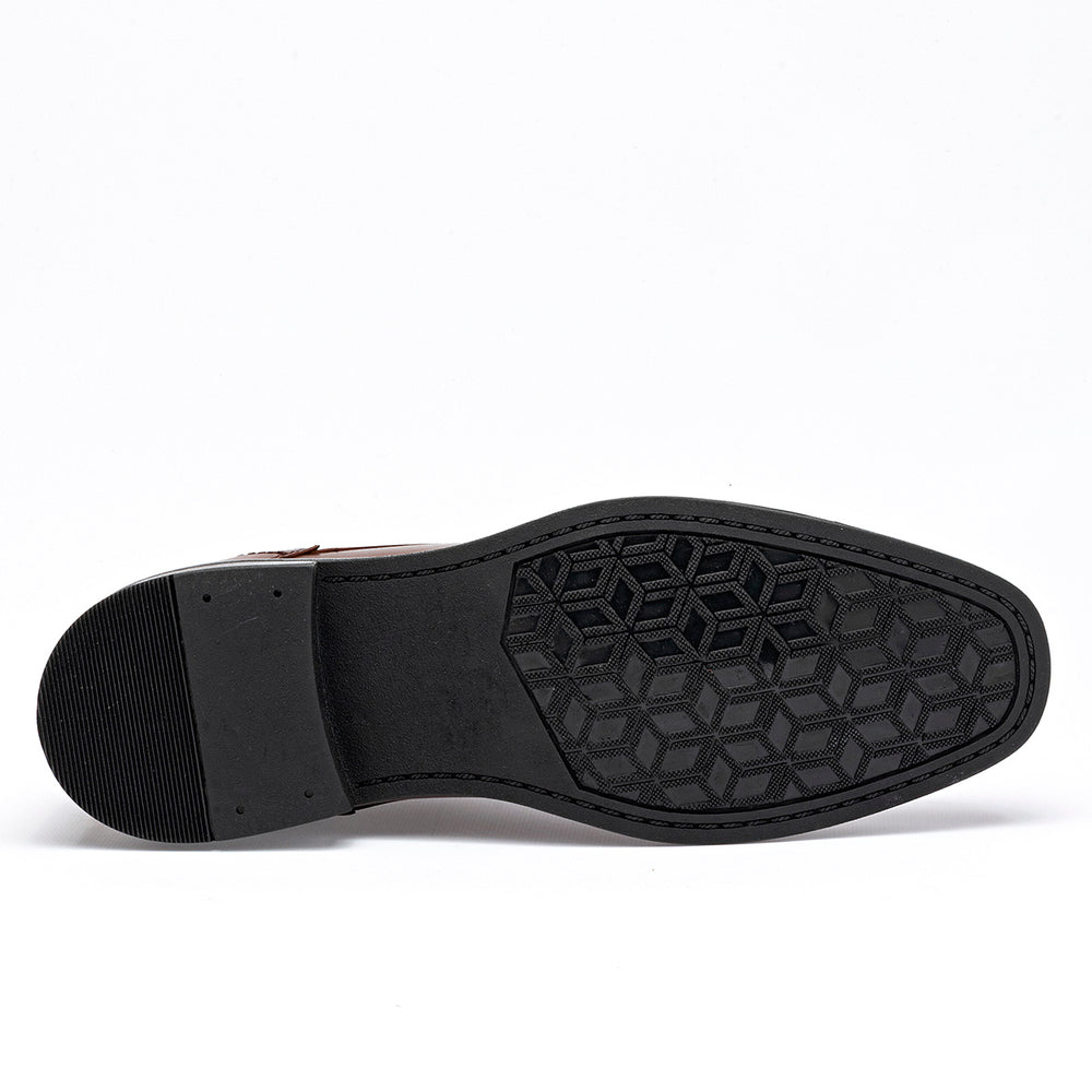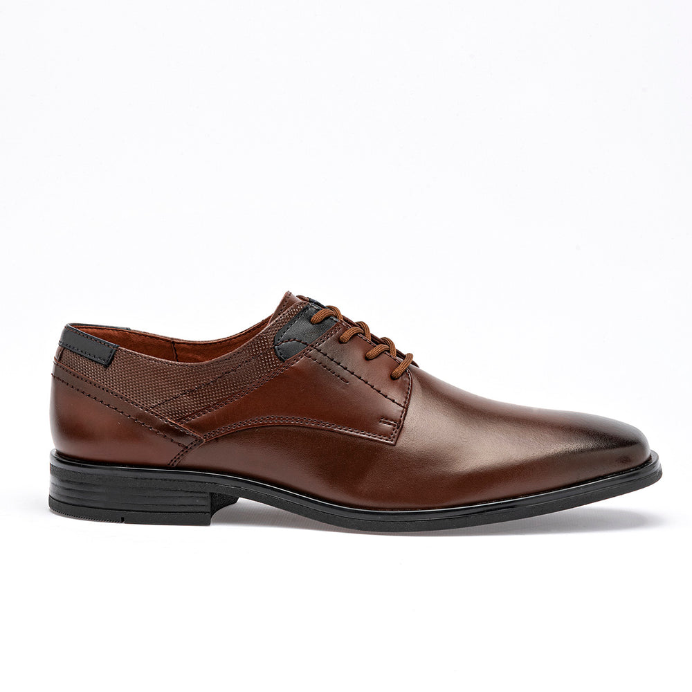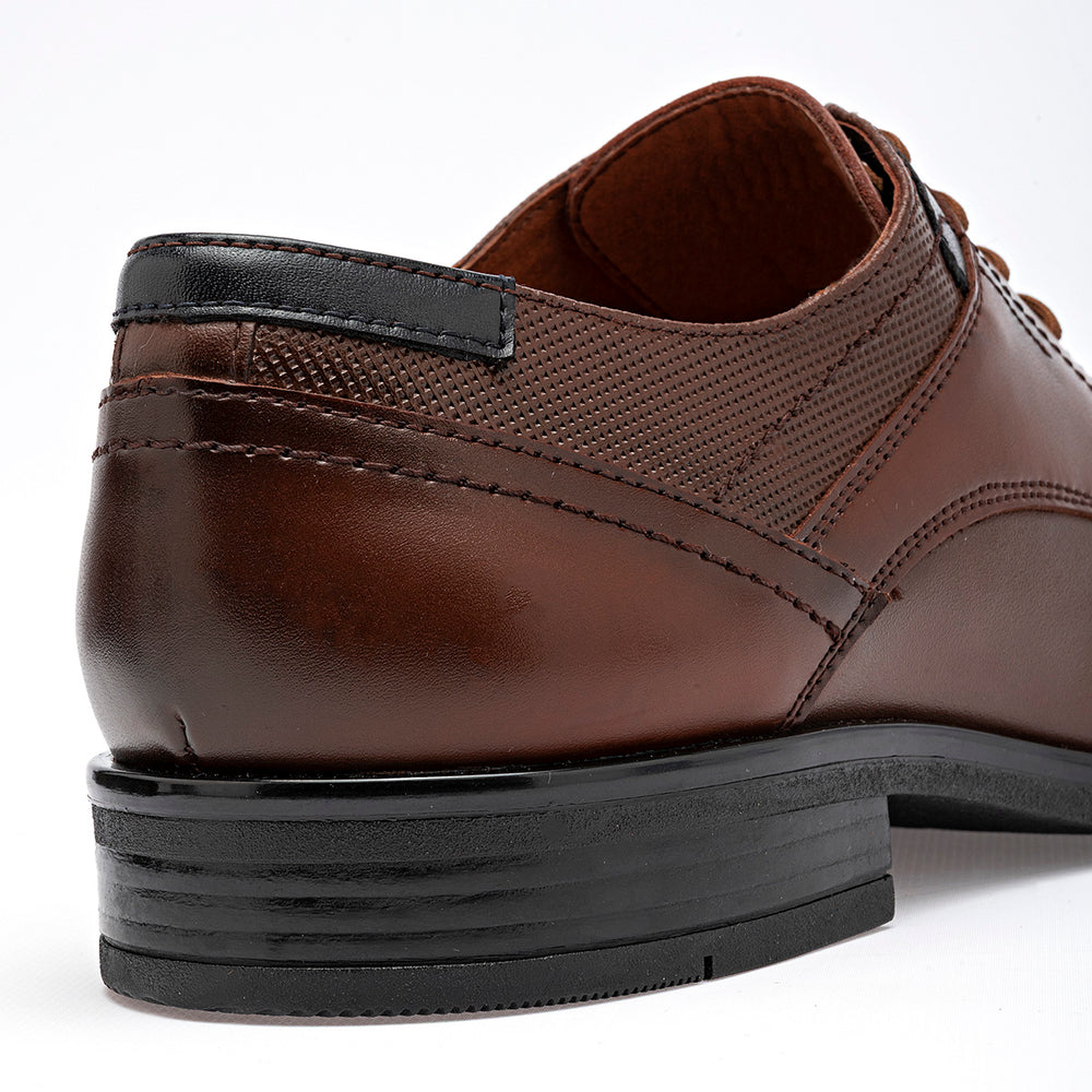 Zapato de vestir tipo Oxford en un sofisticado color café castaño con un acabado semibrillante. El diseño destaca por su construcción mixta, que une paneles de material sintético liso con una sección de textura microperforada o trenzada en los laterales y el cuello. Cuenta con un sistema de ajuste por agujetas redondas a tono, un elegante efecto degradado oscuro en la puntera y una suela de vestir delgada en color negro que le otorga un perfil esbelto y distinguido.