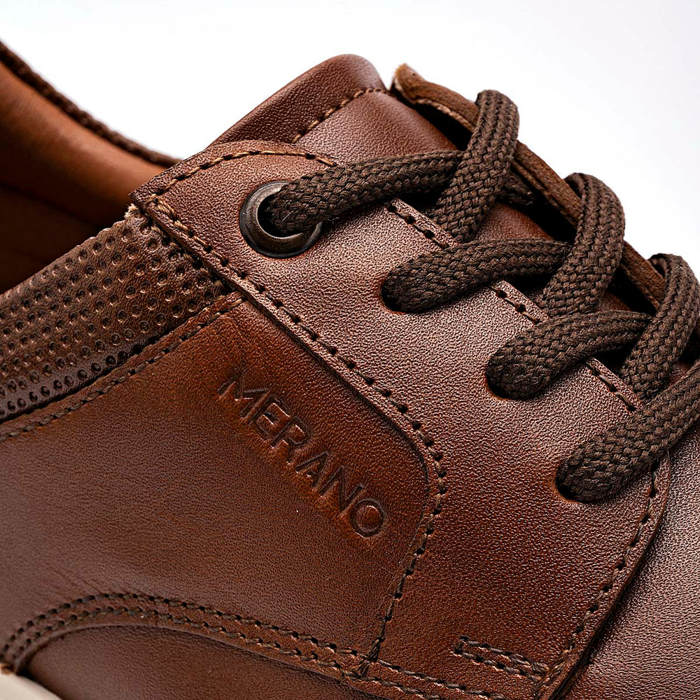 Zapato casual de estilo Derby en un rico tono café rojizo con acabado degradado en la puntera. El diseño destaca por su construcción en material sintético liso de alta calidad, complementado con un cuello de tela texturizada en el mismo tono para un toque moderno. Cuenta con un sistema de ajuste por agujetas redondas a tono, el nombre de la marca grabado discretamente en el lateral y una suela de goma blanca tipo "cupsole" que ofrece un perfil limpio y deportivo.