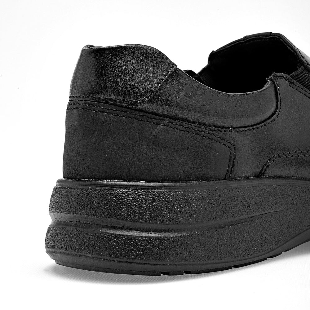 Zapato casual de tipo slip-on en color negro con un diseño minimalista y estructurado. El calzado está fabricado con un material sintético de acabado liso y cuenta con paneles elásticos laterales ocultos que permiten un calce rápido y sin necesidad de agujetas. Presenta una puntera redondeada con costuras de refuerzo perimetrales, un cuello acolchado para proteger el tobillo y una suela de poliuretano inyectado de perfil grueso que ofrece una excelente amortiguación y soporte.