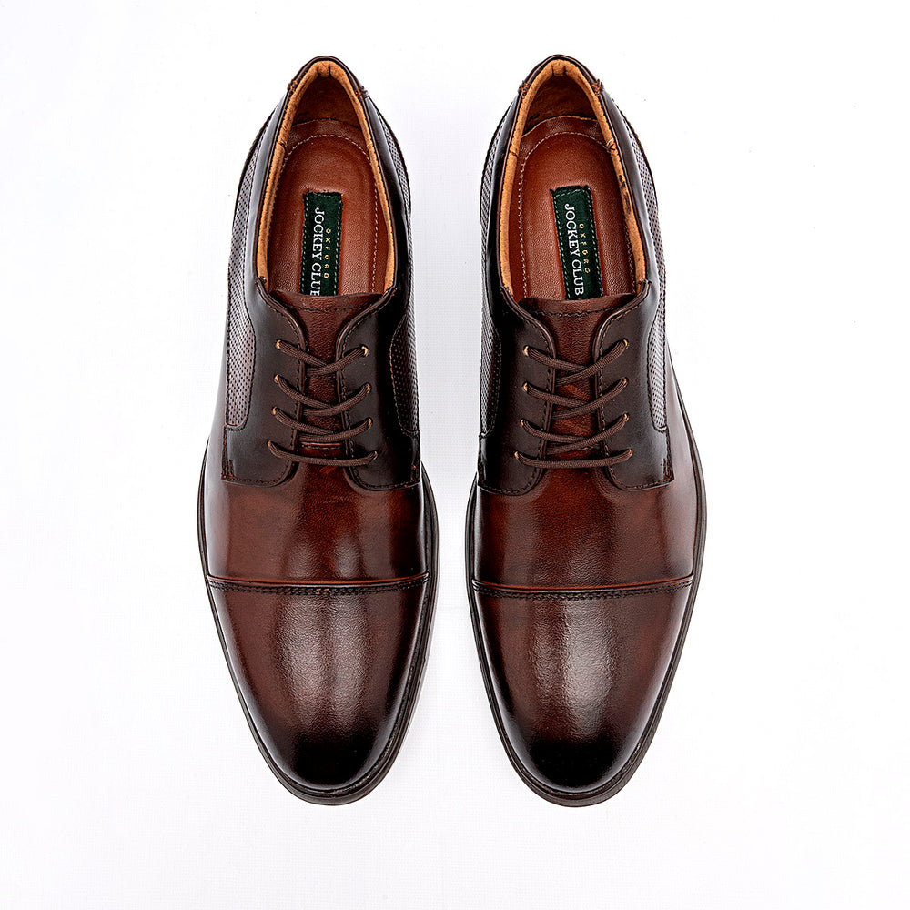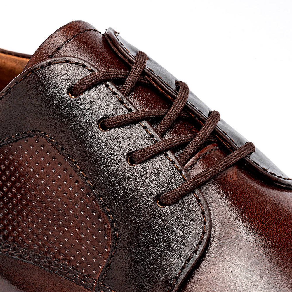 Zapato de vestir formal tipo Oxford Cap Toe en un profundo color café borgoña con acabado brillante. El diseño presenta una puntera lisa con costura transversal clásica y paneles laterales con un texturizado de microperforaciones que añade profundidad visual y un toque moderno. Cuenta con un sistema de cierre de cordones delgados encerados, un forro interior en tono canela y una suela de perfil bajo a juego que mantiene la elegancia de la silueta.