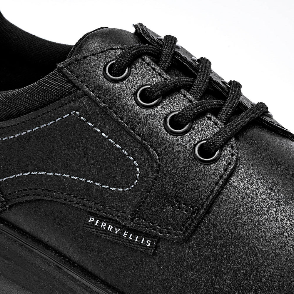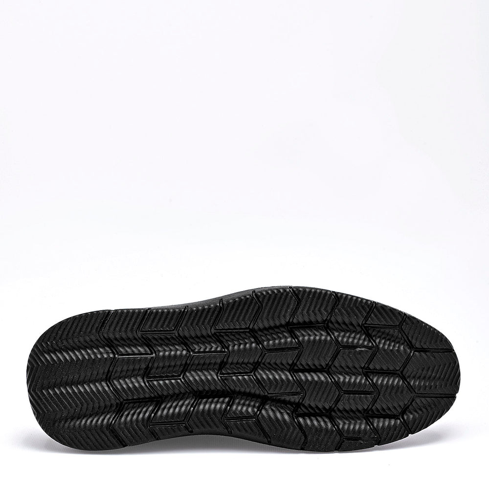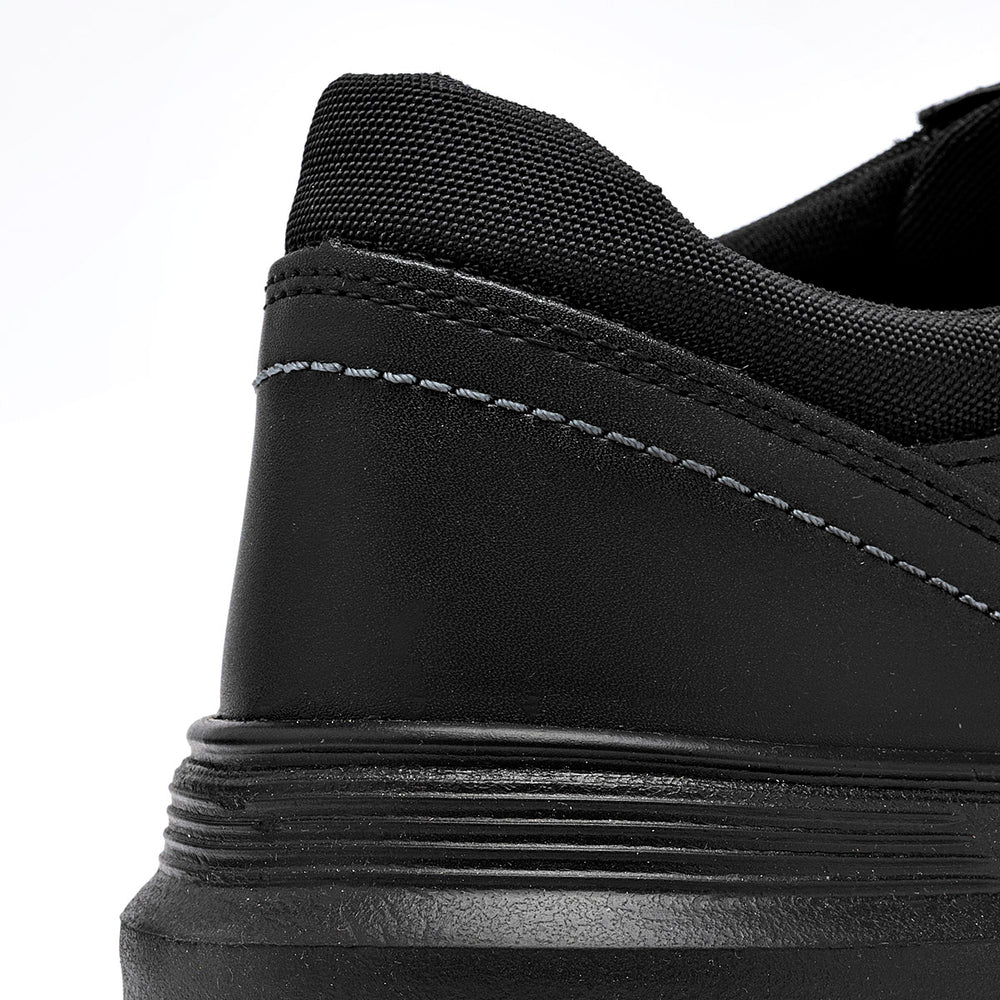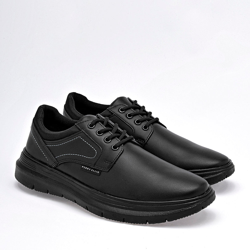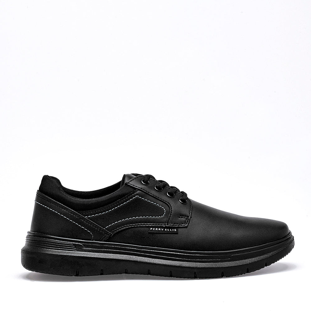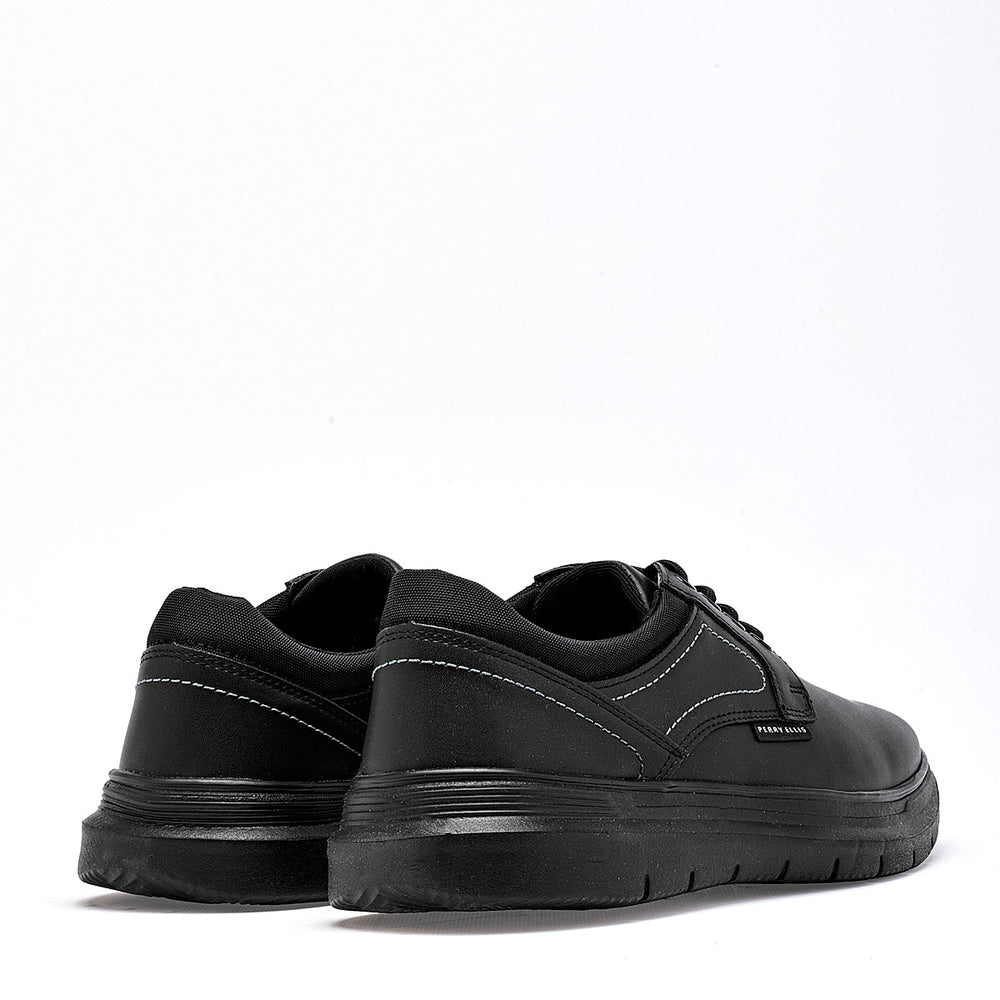 Zapato casual de tipo Derby en color negro integral, diseñado con una estética minimalista y funcional. La parte superior está fabricada en un material sintético liso de alta calidad, con costuras decorativas tonales que refuerzan su estructura. El diseño incluye un cuello acolchado de material textil para evitar rozaduras, cordones redondos y una suela técnica negra con ranuras de flexión que garantizan una pisada suave y ligera.
