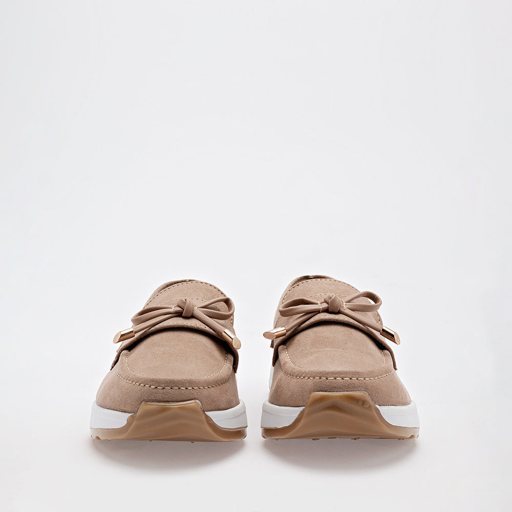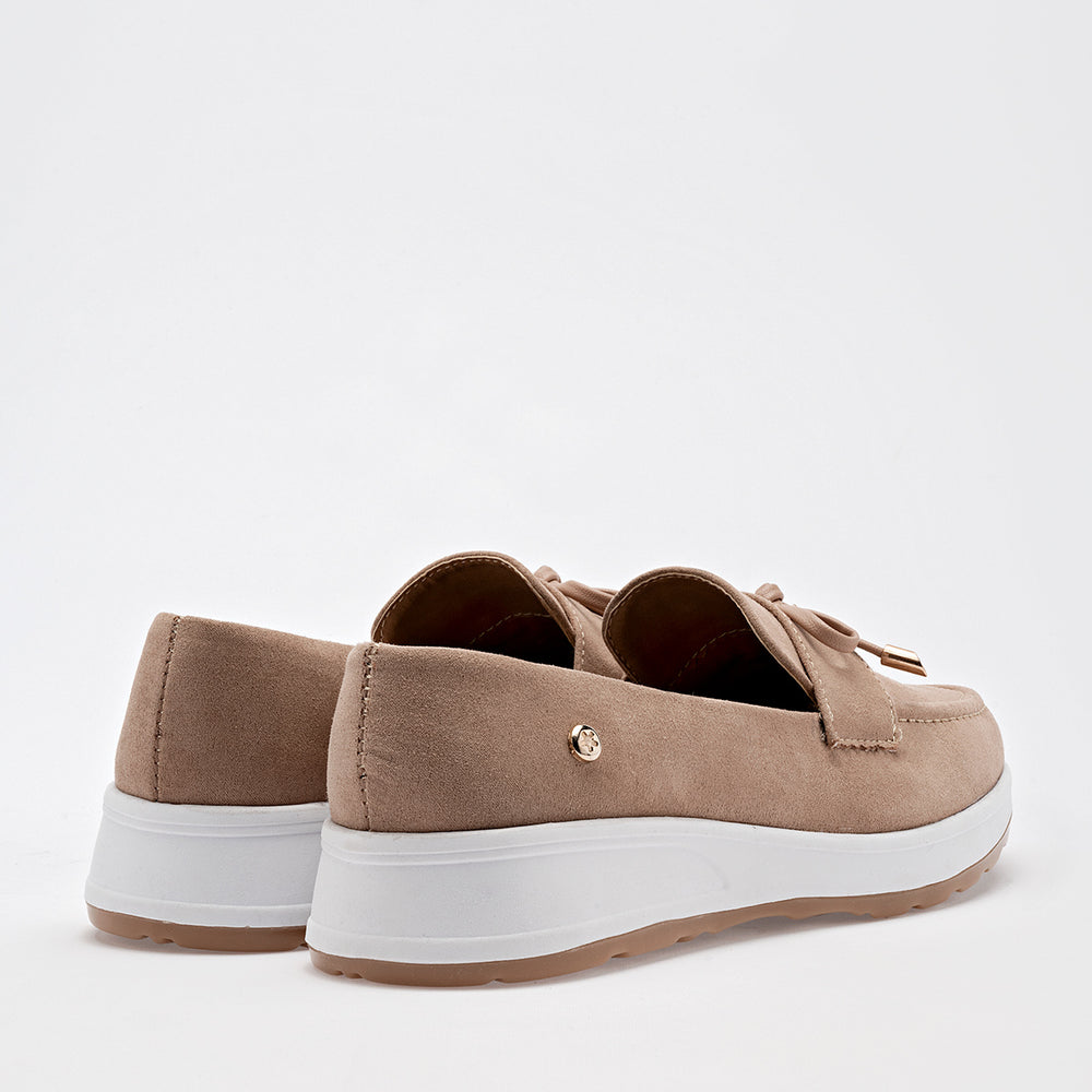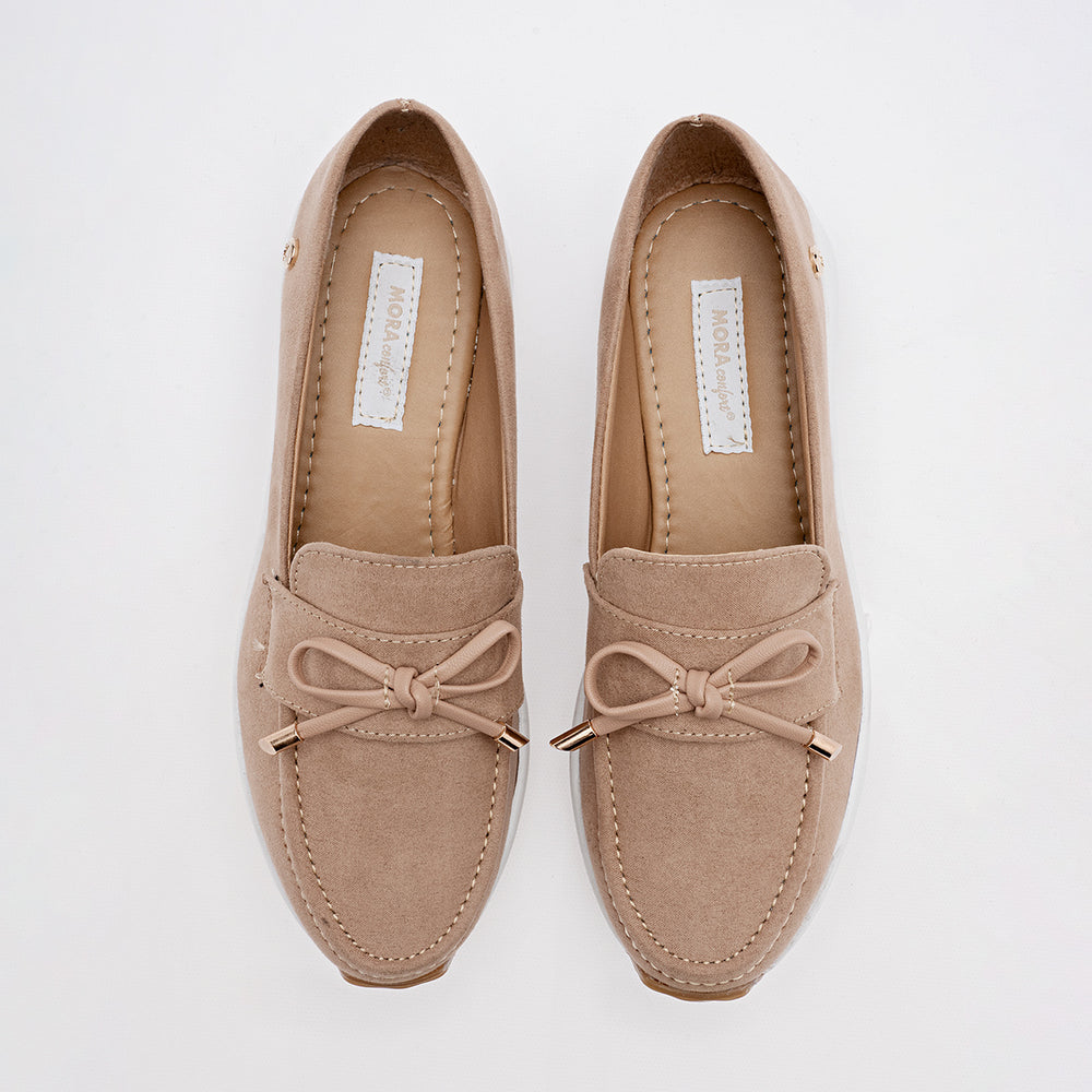 Zapato tipo mocasín de confort para mujer, confeccionado en un material textil con acabado de gamuza suave en color beige (nude). Presenta una costura visible alrededor de la puntera que resalta su estructura artesanal y un lazo delicado en el empeine con terminales metálicos dorados. El diseño se complementa con una suela de plataforma ligera en color blanco, que ofrece una amortiguación superior, y un pequeño pin metálico de la marca en el lateral del talón.