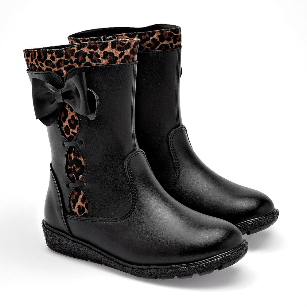 Bota de caña media para niña, confeccionada en material sintético de color negro con un acabado mate suave. El diseño destaca por su contraste de texturas, incorporando un estampado de animal (leopardo) en el borde superior y en una franja vertical lateral adornada con cortes circulares. Como detalle final, presenta un moño decorativo negro en el costado y una suela de goma oscura con discretos destellos de brillo para un toque mágico.